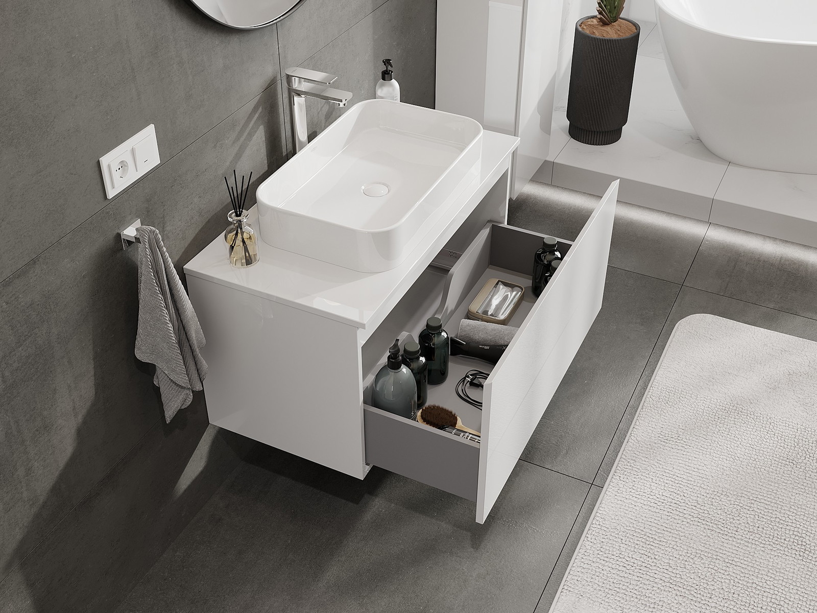 Utskärningen i lådan är utformad på ett sådant sätt att den rymmer vattenlåset som är nödvändigt i tvättställsinstallationer. Tack vare detta kan möbeln installeras fullt ut funktionellt, utan att behöva avstå från utrymme i lådan för installationen.