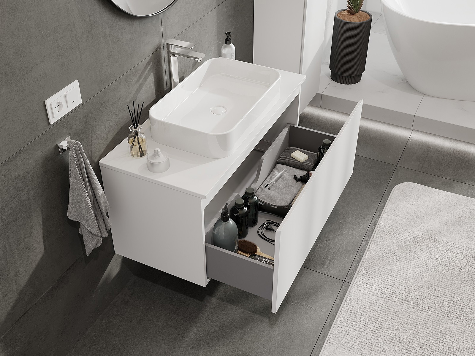 Utskärningen i lådan är utformad på ett sådant sätt att den rymmer vattenlåset som är nödvändigt i tvättställsinstallationer. Tack vare detta kan möbeln installeras fullt ut funktionellt, utan att behöva avstå från utrymme i lådan för installationen.
