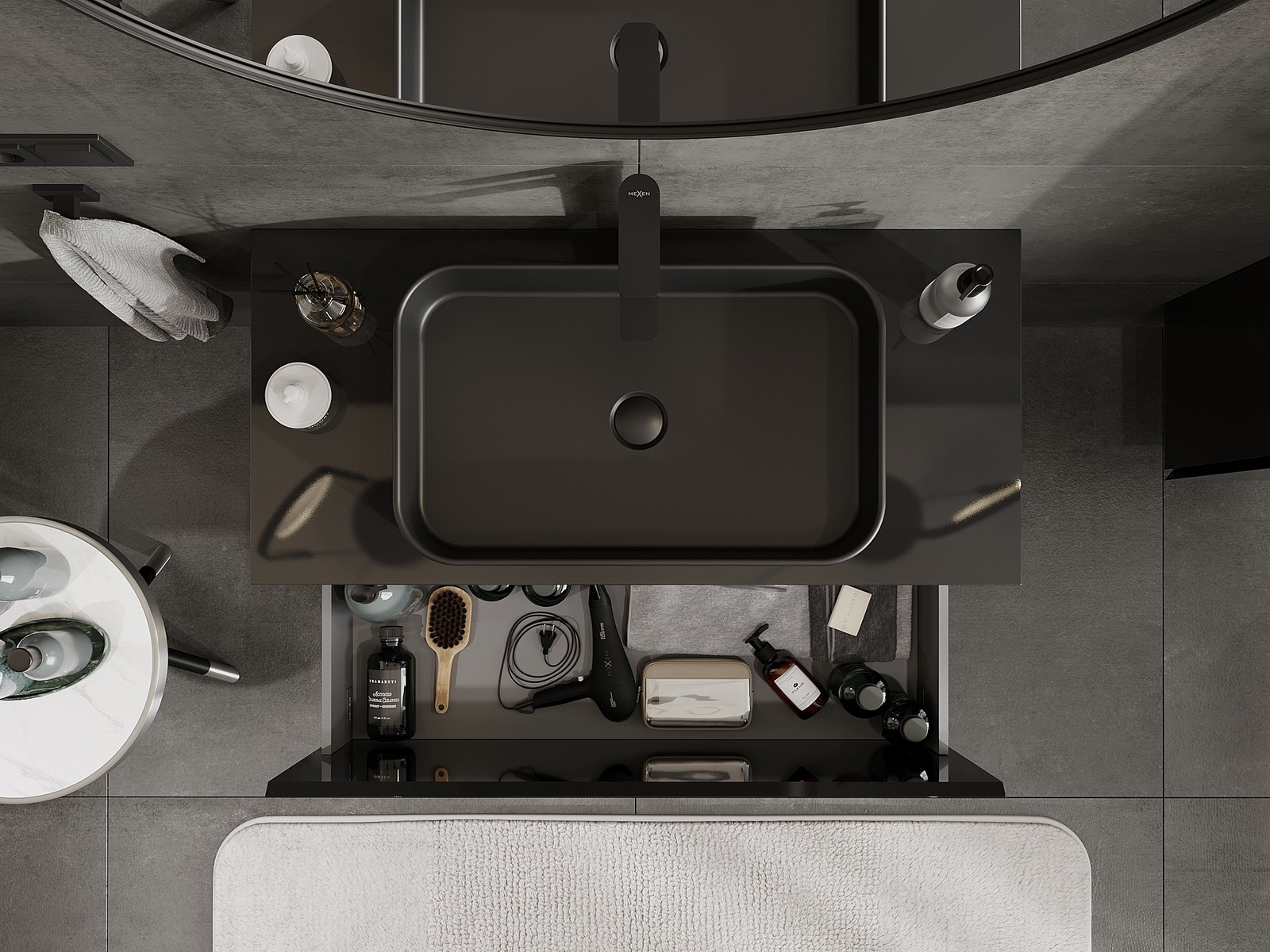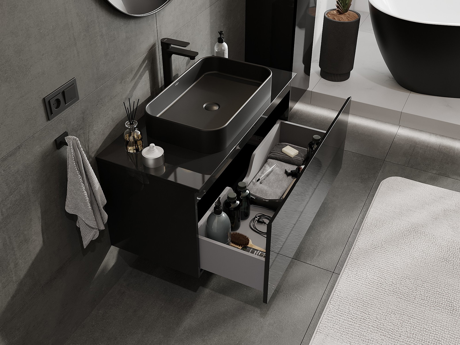 Utskärningen i lådan är utformad på ett sådant sätt att den rymmer vattenlåset som är nödvändigt i tvättställsinstallationer. Tack vare detta kan möbeln installeras fullt ut funktionellt, utan att behöva avstå från utrymme i lådan för installationen.