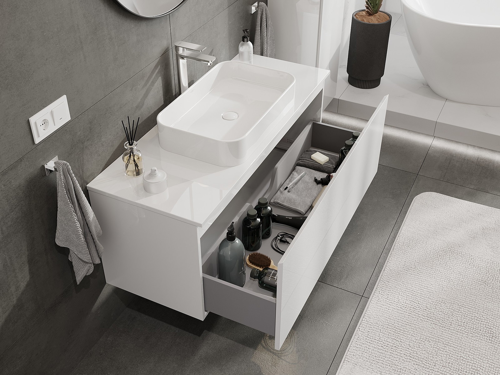 Utskärningen i lådan är utformad på ett sådant sätt att den rymmer vattenlåset som är nödvändigt i tvättställsinstallationer. Tack vare detta kan möbeln installeras fullt ut funktionellt, utan att behöva avstå från utrymme i lådan för installationen.