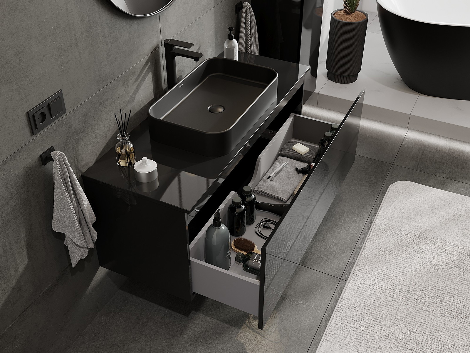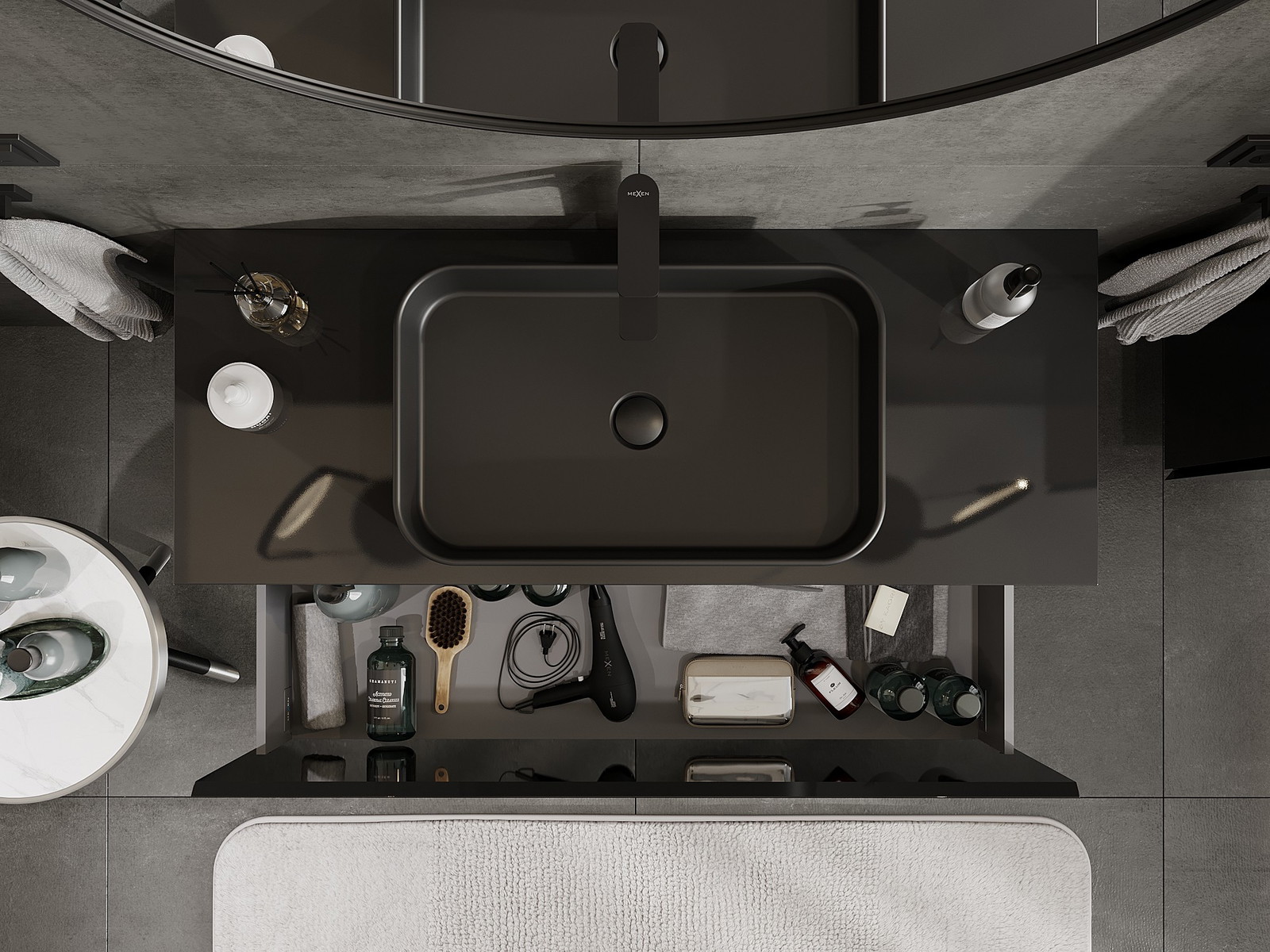Mexen Orio badrumsskåp under tvättställ 120 cm med bänkskiva, 1 låda, svart blank - 91A10-12047-1-BFC70