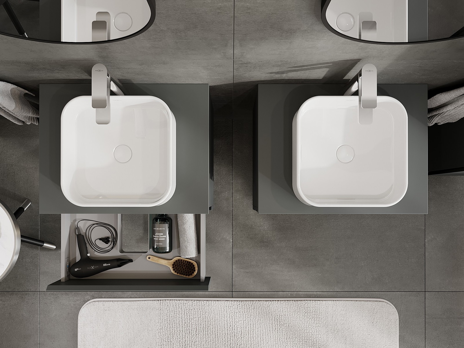 Utskärningen i lådan är utformad på ett sådant sätt att den rymmer vattenlåset som är nödvändigt i tvättställsinstallationer. Tack vare detta kan möbeln installeras fullt ut funktionellt, utan att behöva avstå från utrymme i lådan för installationen.
