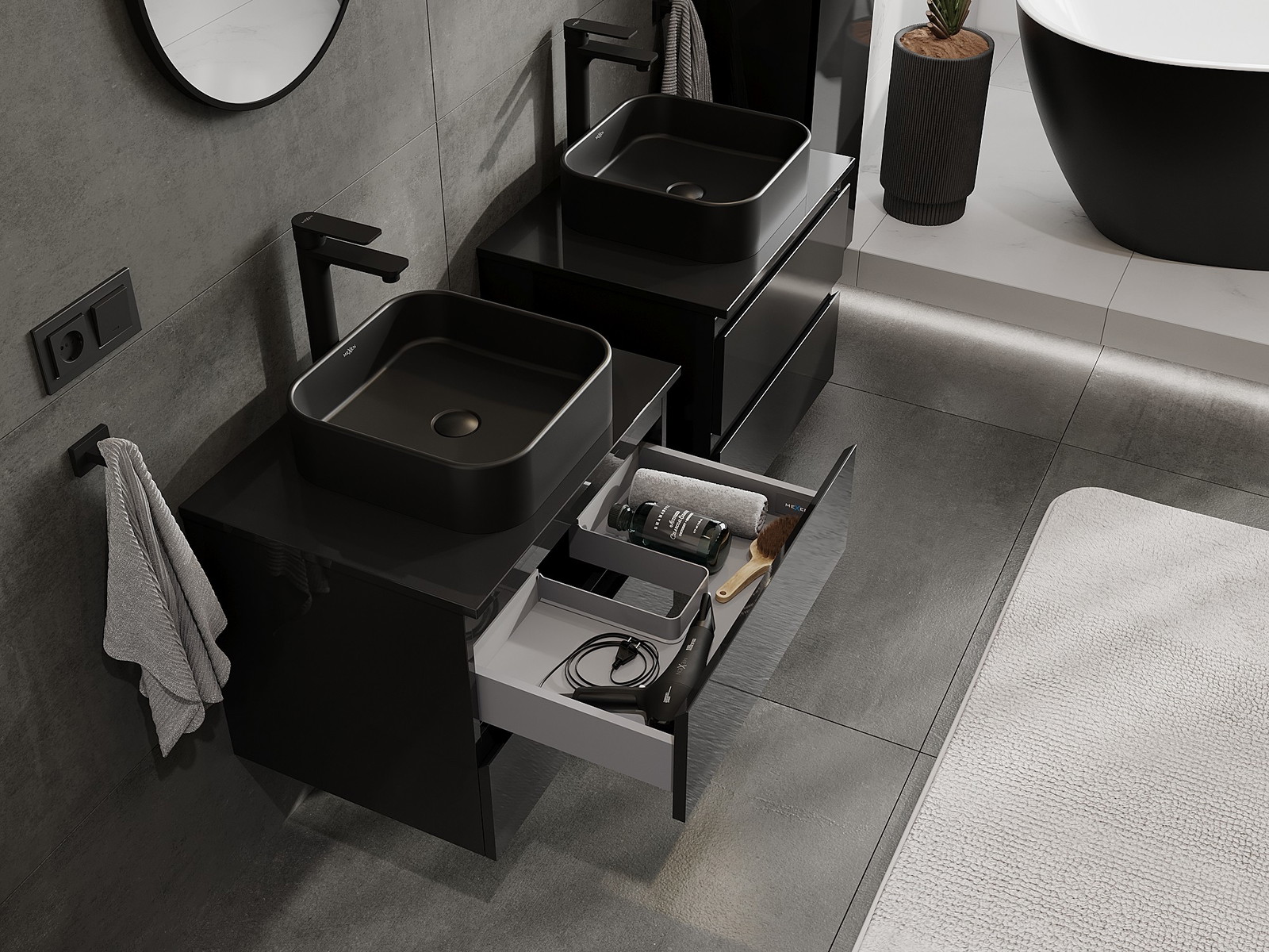 Utskärningen i lådan är utformad på ett sådant sätt att den rymmer vattenlåset som är nödvändigt i tvättställsinstallationer. Tack vare detta kan möbeln installeras fullt ut funktionellt, utan att behöva avstå från utrymme i lådan för installationen.