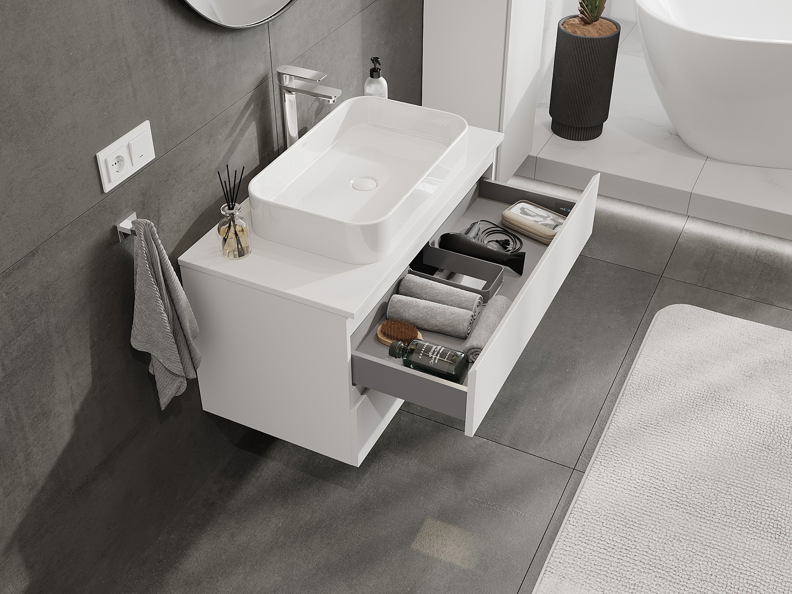 Utskärningen i lådan är utformad på ett sådant sätt att den rymmer vattenlåset som är nödvändigt i tvättställsinstallationer. Tack vare detta kan möbeln installeras fullt ut funktionellt, utan att behöva avstå från utrymme i lådan för installationen.