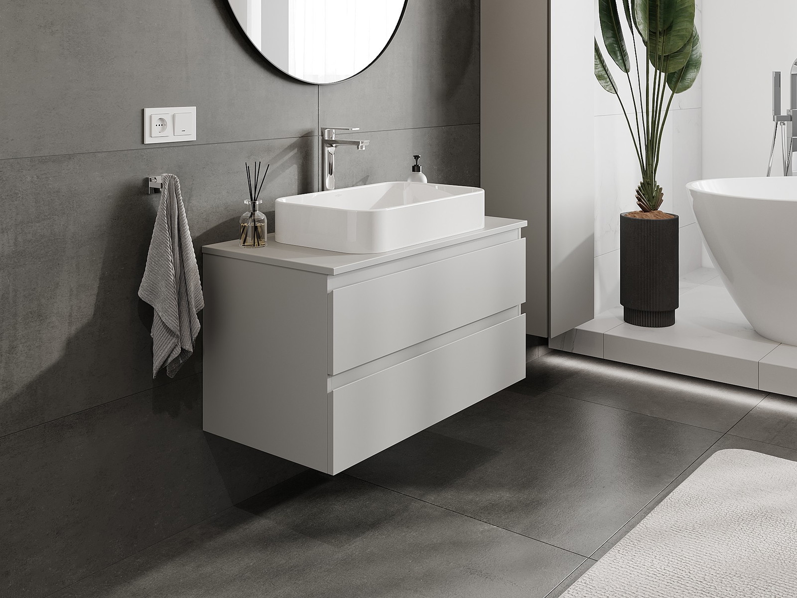 Skivan täckt med högkvalitativ lack är ett utmärkt val för badrummet, den ger ett elegant utseende samt hög motståndskraft mot fukt och repor. Högkvalitativ lack skyddar ytan på bänkskivan, vilket säkerställer dess långvariga hållbarhet, estetik och enkelhet i underhåll.