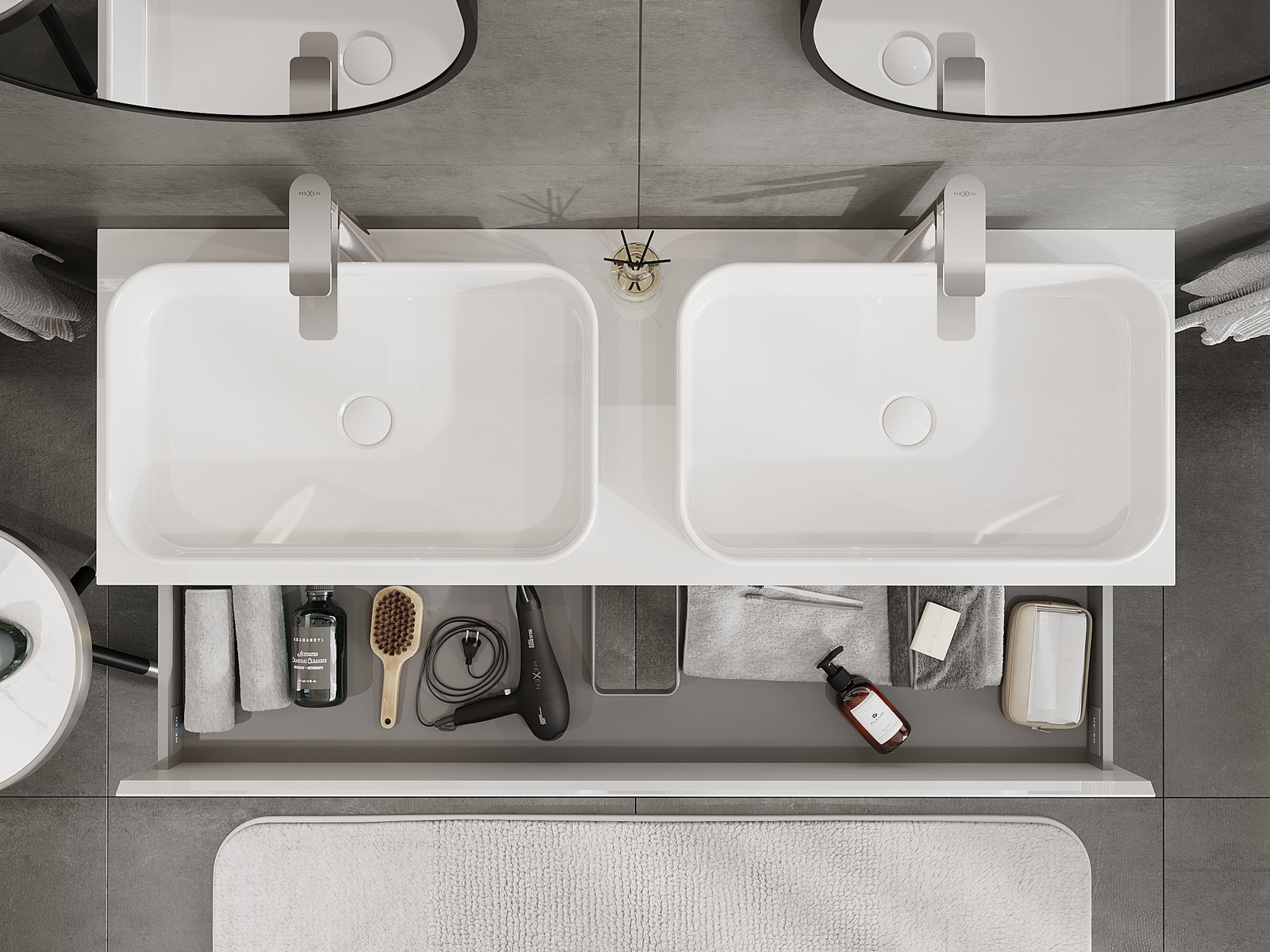 Utskärningen i lådan är utformad på ett sådant sätt att den rymmer vattenlåset som är nödvändigt i tvättställsinstallationer. Tack vare detta kan möbeln installeras fullt ut funktionellt, utan att behöva avstå från utrymme i lådan för installationen.