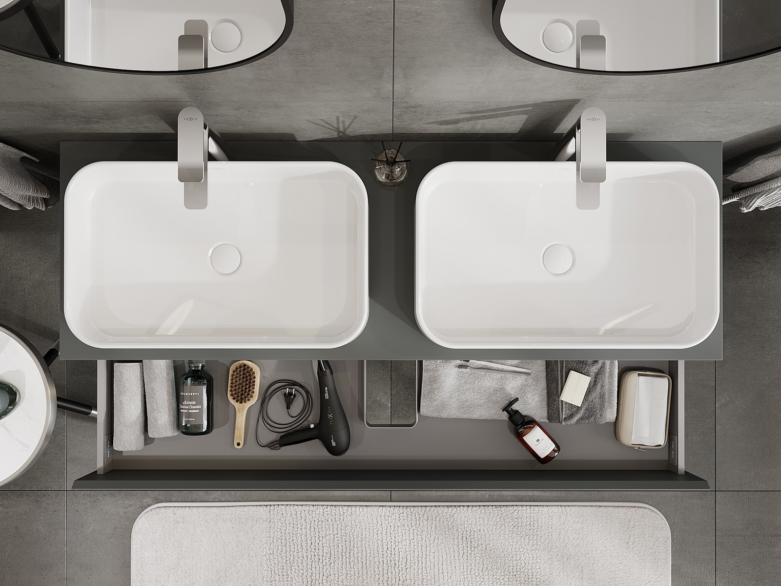 Utskärningen i lådan är utformad på ett sådant sätt att den rymmer vattenlåset som är nödvändigt i tvättställsinstallationer. Tack vare detta kan möbeln installeras fullt ut funktionellt, utan att behöva avstå från utrymme i lådan för installationen.