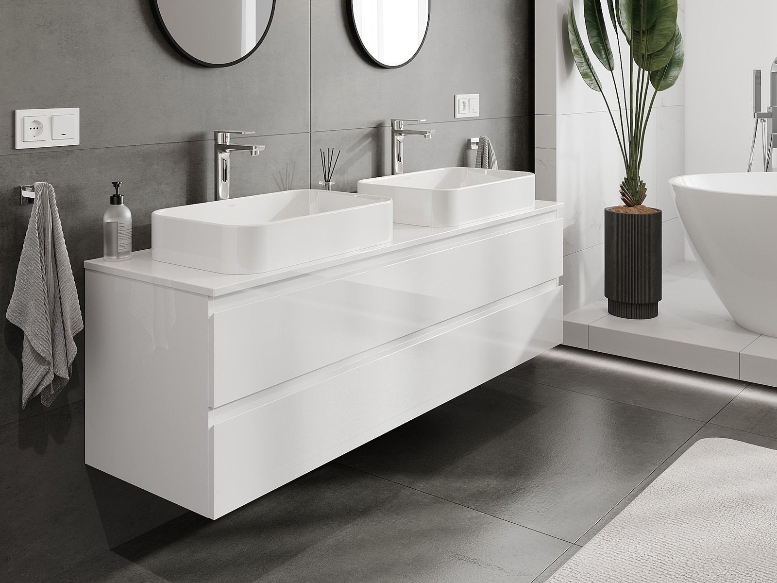 Skivan täckt med högkvalitativ lack är ett utmärkt val för badrummet, den ger ett elegant utseende samt hög motståndskraft mot fukt och repor. Högkvalitativ lack skyddar ytan på bänkskivan, vilket säkerställer dess långvariga hållbarhet, estetik och enkelhet i underhåll.