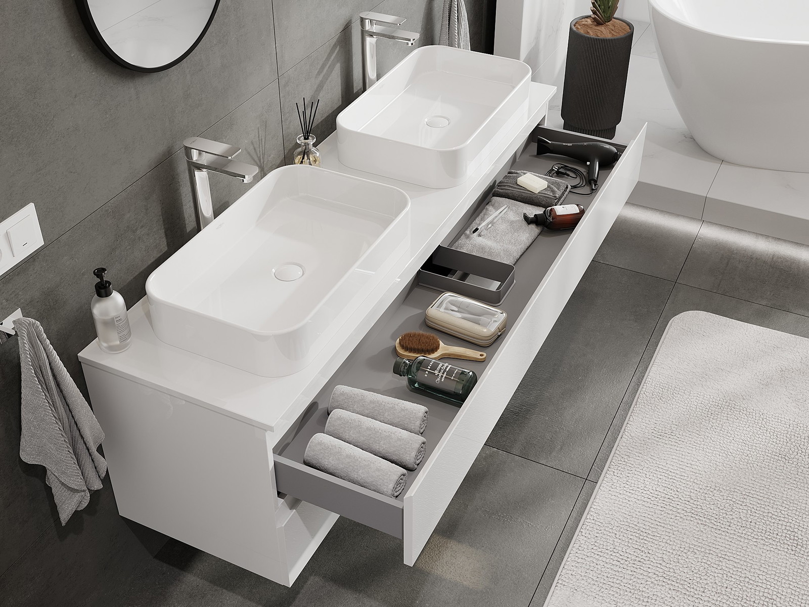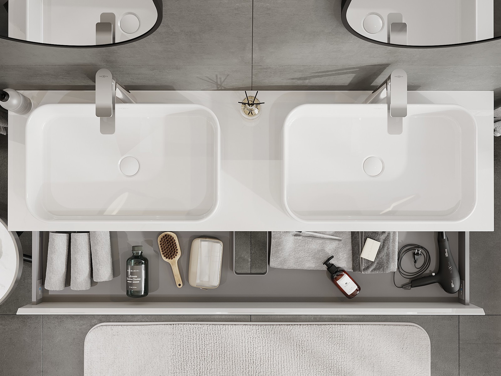 Utskärningen i lådan är utformad på ett sådant sätt att den rymmer vattenlåset som är nödvändigt i tvättställsinstallationer. Tack vare detta kan möbeln installeras fullt ut funktionellt, utan att behöva avstå från utrymme i lådan för installationen.