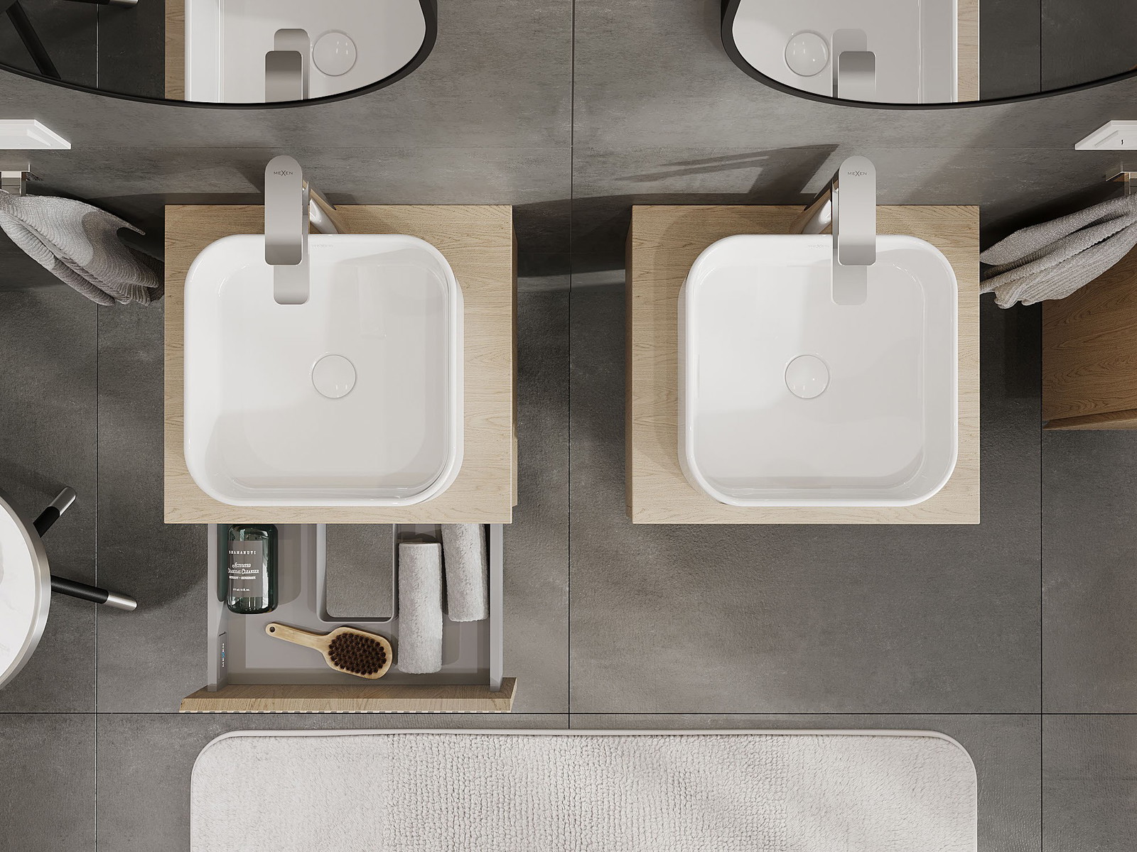 Utskärningen i lådan är utformad på ett sådant sätt att den rymmer vattenlåset som är nödvändigt i tvättställsinstallationer. Tack vare detta kan möbeln installeras fullt ut funktionellt, utan att behöva avstå från utrymme i lådan för installationen.