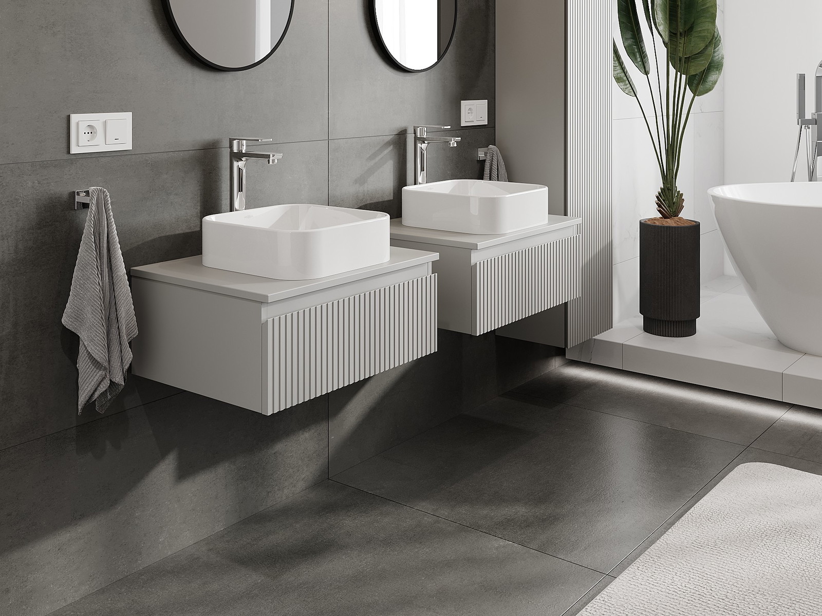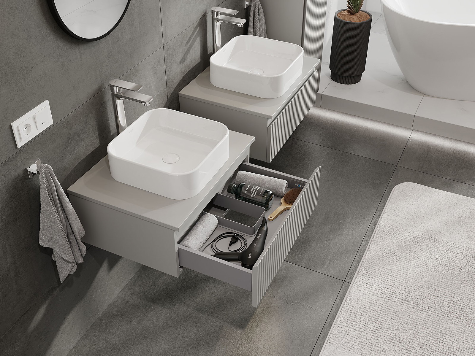 Våra modulära badrumsmöbler kan kombineras i olika färgkonfigurationer, vilket möjliggör fullständig personalisering. Du kan välja både utseende och funktioner för respektive delar, vilket gör att möblerna kan anpassas till dina egna stilistiska och funktionella preferenser.