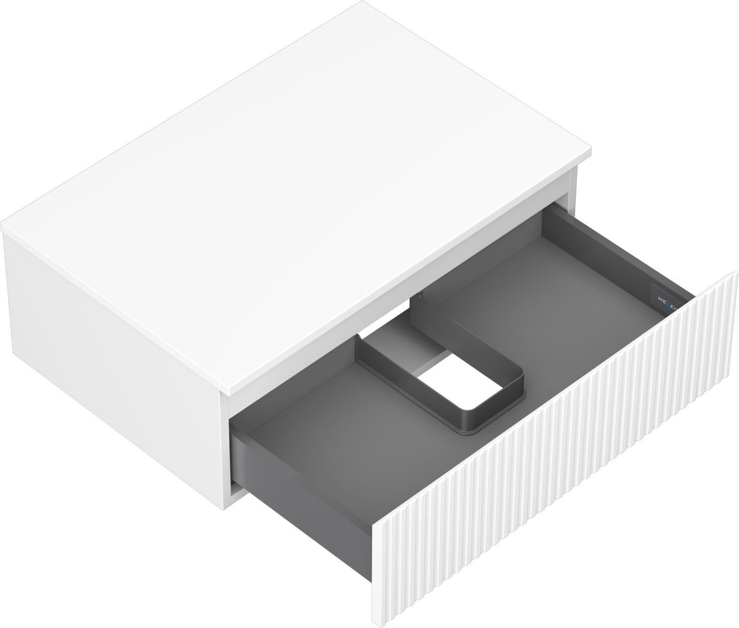 Utskärningen i lådan är utformad på ett sådant sätt att den rymmer vattenlåset som är nödvändigt i tvättställsinstallationer. Tack vare detta kan möbeln installeras fullt ut funktionellt, utan att behöva avstå från utrymme i lådan för installationen.