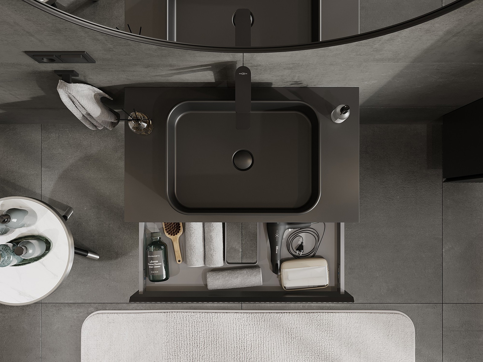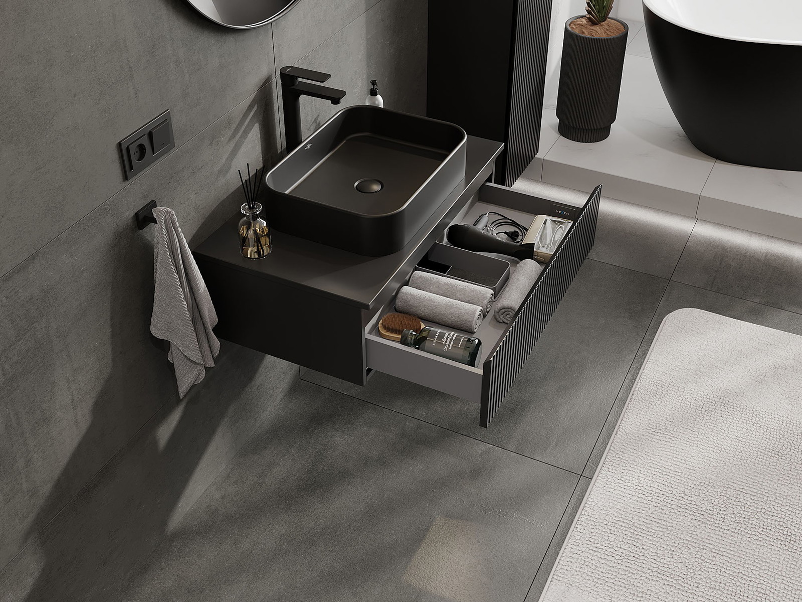 Mexen Rivel badrumsskåp under tvättställ 80 cm med bänkskiva, 1 låda, räfflad, svart matt - 91A20-08023-1-BFC71