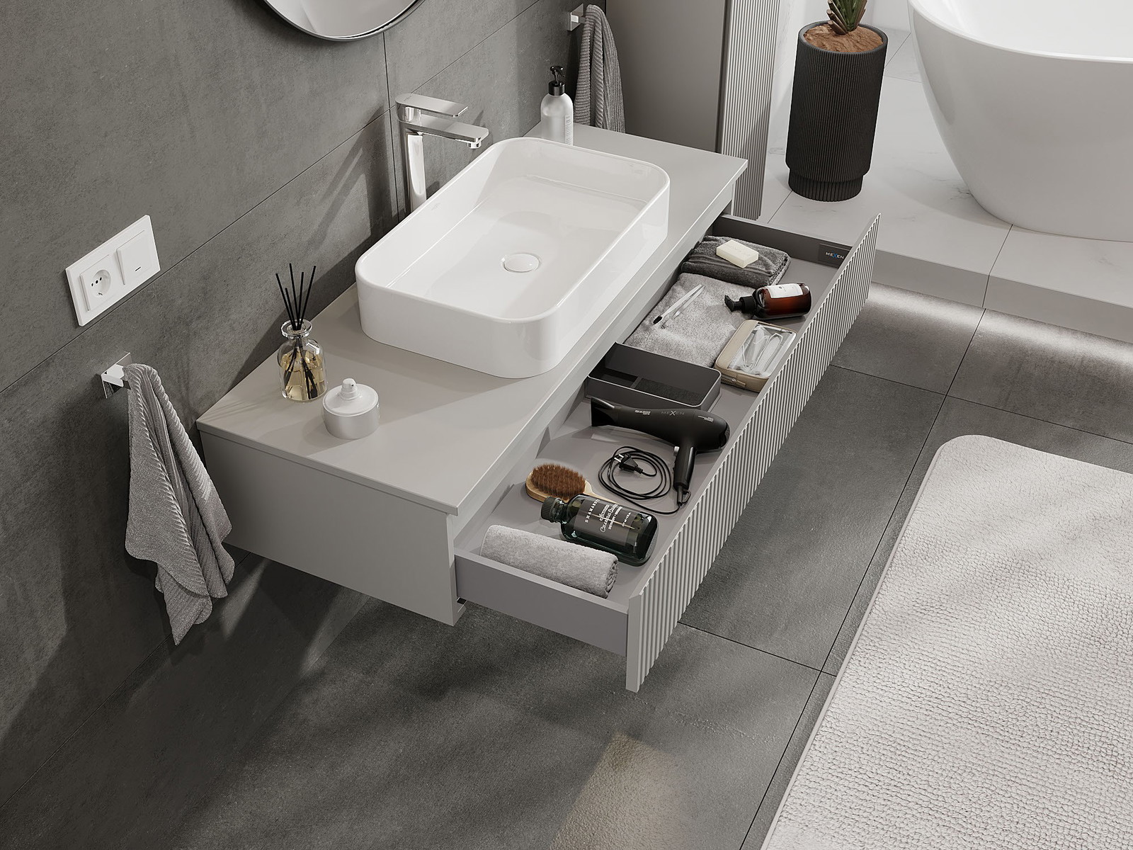 Utskärningen i lådan är utformad på ett sådant sätt att den rymmer vattenlåset som är nödvändigt i tvättställsinstallationer. Tack vare detta kan möbeln installeras fullt ut funktionellt, utan att behöva avstå från utrymme i lådan för installationen.
