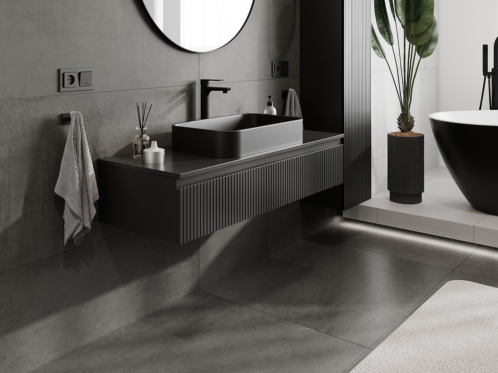 Mexen Rivel 120 cm badrumsskåp under tvättställ med bänkskiva, 1 låda, räfflad, svart matt - 91A20-12023-1-BFC71