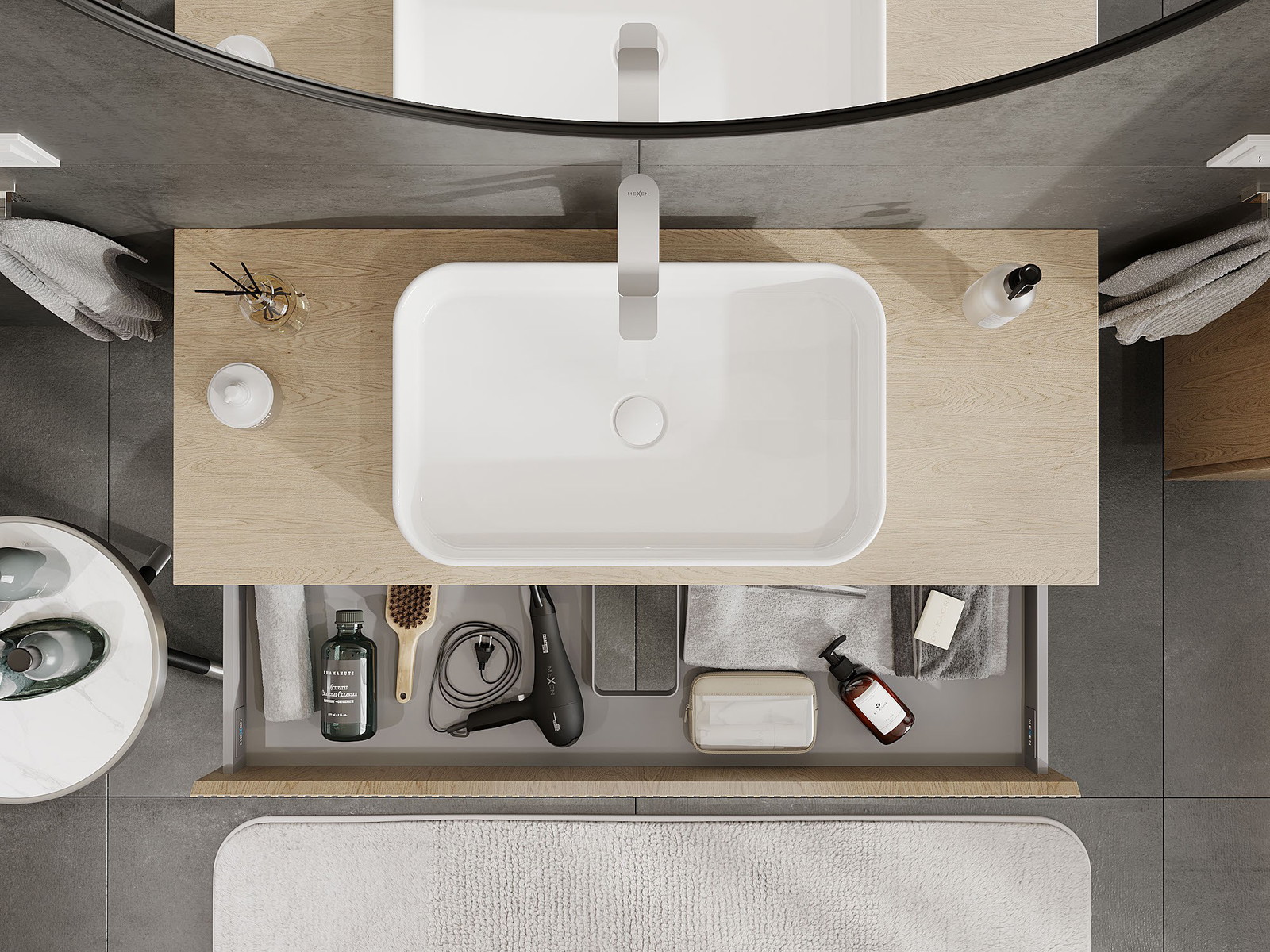 Utskärningen i lådan är utformad på ett sådant sätt att den rymmer vattenlåset som är nödvändigt i tvättställsinstallationer. Tack vare detta kan möbeln installeras fullt ut funktionellt, utan att behöva avstå från utrymme i lådan för installationen.