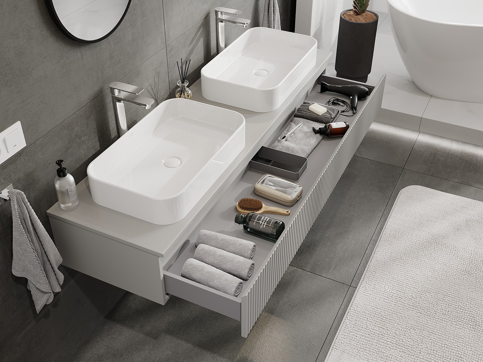 Mexen Rivel badrumsskåp under tvättställ 160 cm med bänkskiva, 1 låda, räfflad, matt grå - 91A20-16023-1-BFC62