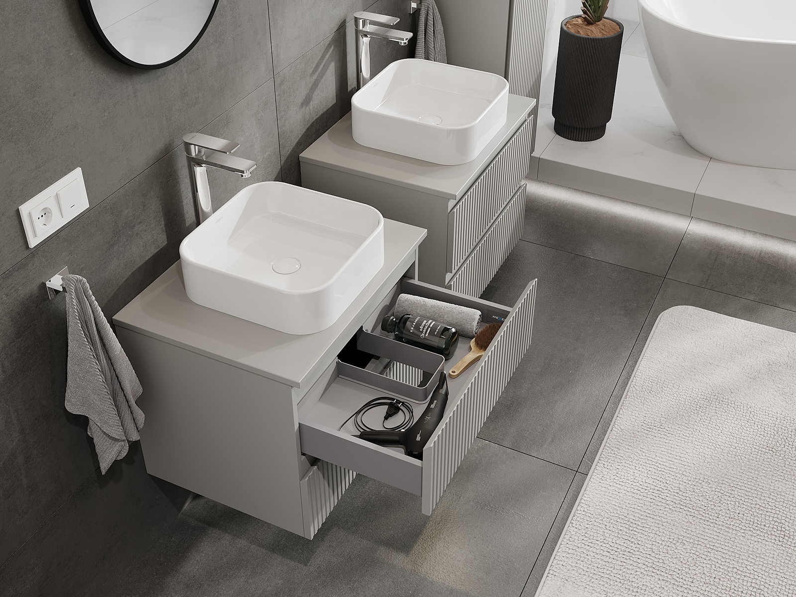 Utskärningen i lådan är utformad på ett sådant sätt att den rymmer vattenlåset som är nödvändigt i tvättställsinstallationer. Tack vare detta kan möbeln installeras fullt ut funktionellt, utan att behöva avstå från utrymme i lådan för installationen.