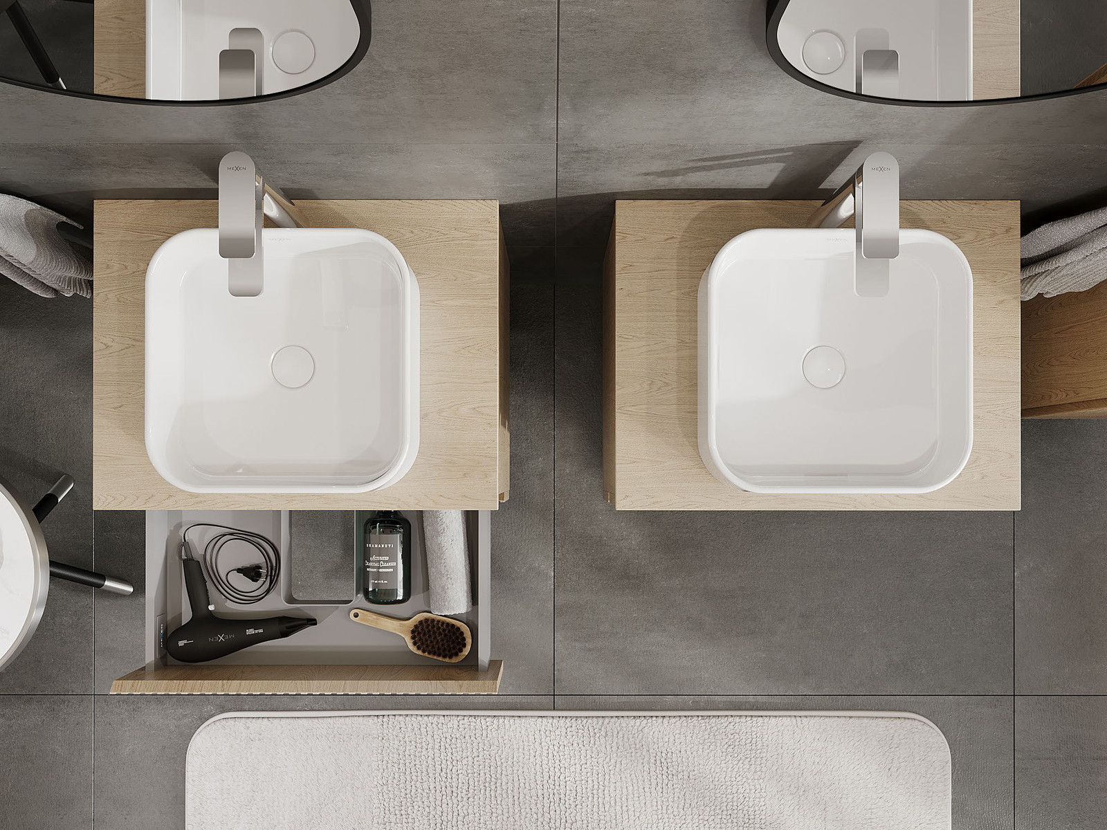 Utskärningen i lådan är utformad på ett sådant sätt att den rymmer vattenlåset som är nödvändigt i tvättställsinstallationer. Tack vare detta kan möbeln installeras fullt ut funktionellt, utan att behöva avstå från utrymme i lådan för installationen.