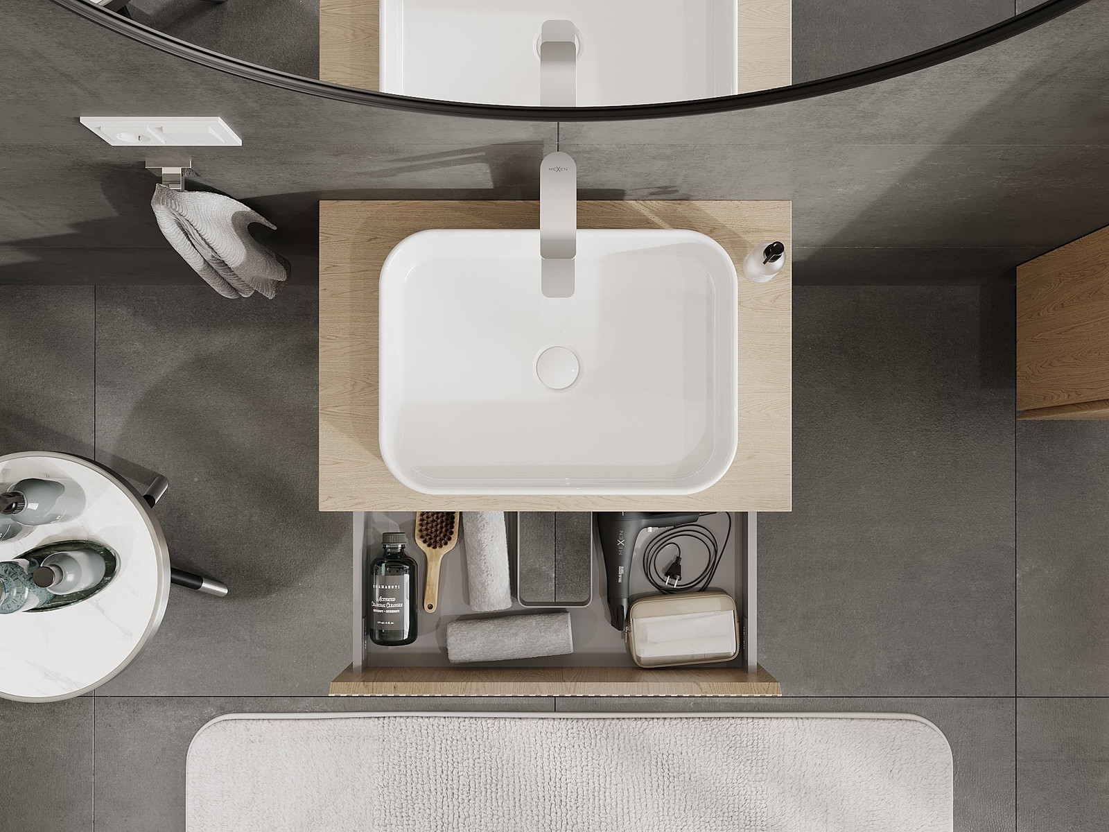 Utskärningen i lådan är utformad på ett sådant sätt att den rymmer vattenlåset som är nödvändigt i tvättställsinstallationer. Tack vare detta kan möbeln installeras fullt ut funktionellt, utan att behöva avstå från utrymme i lådan för installationen.