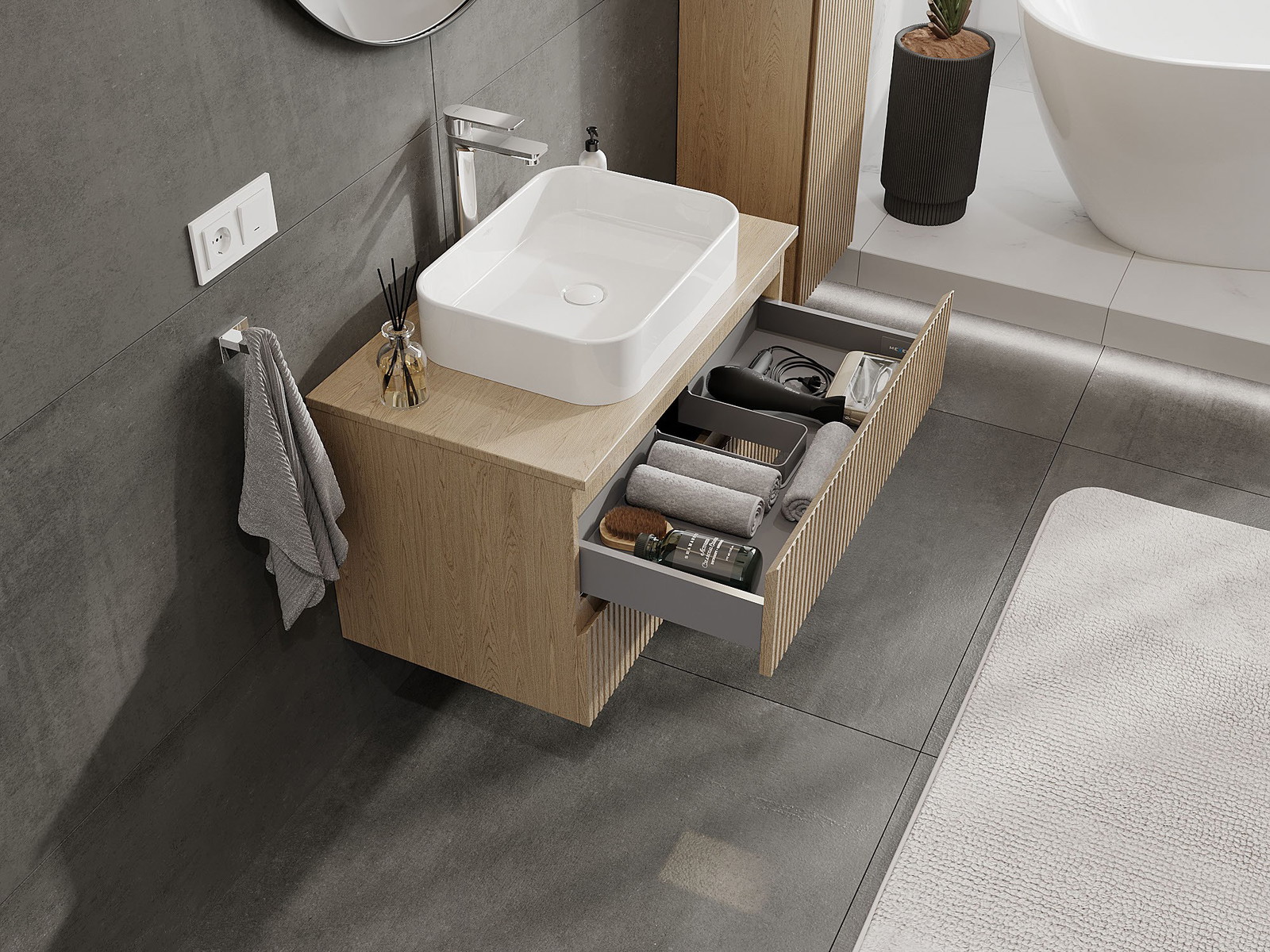 Utskärningen i lådan är utformad på ett sådant sätt att den rymmer vattenlåset som är nödvändigt i tvättställsinstallationer. Tack vare detta kan möbeln installeras fullt ut funktionellt, utan att behöva avstå från utrymme i lådan för installationen.