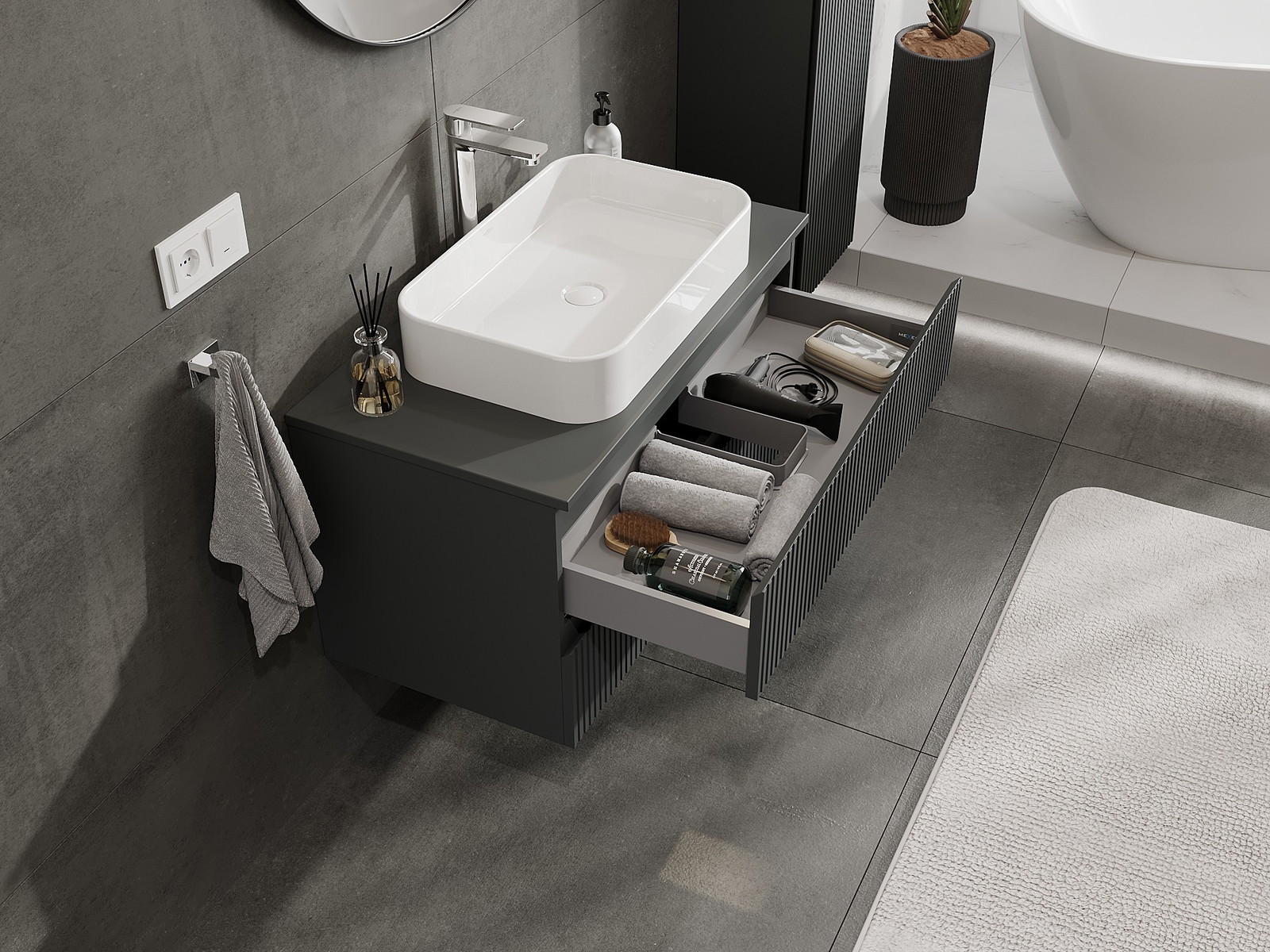 Utskärningen i lådan är utformad på ett sådant sätt att den rymmer vattenlåset som är nödvändigt i tvättställsinstallationer. Tack vare detta kan möbeln installeras fullt ut funktionellt, utan att behöva avstå från utrymme i lådan för installationen.