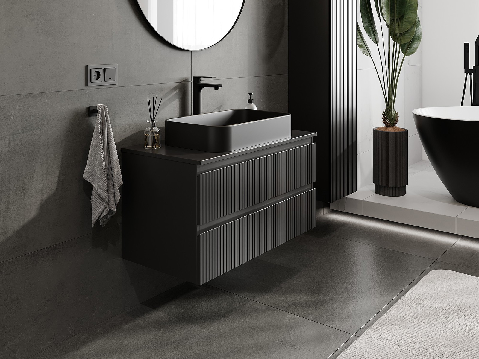 Utskärningen i lådan är utformad på ett sådant sätt att den rymmer vattenlåset som är nödvändigt i tvättställsinstallationer. Tack vare detta kan möbeln installeras fullt ut funktionellt, utan att behöva avstå från utrymme i lådan för installationen.