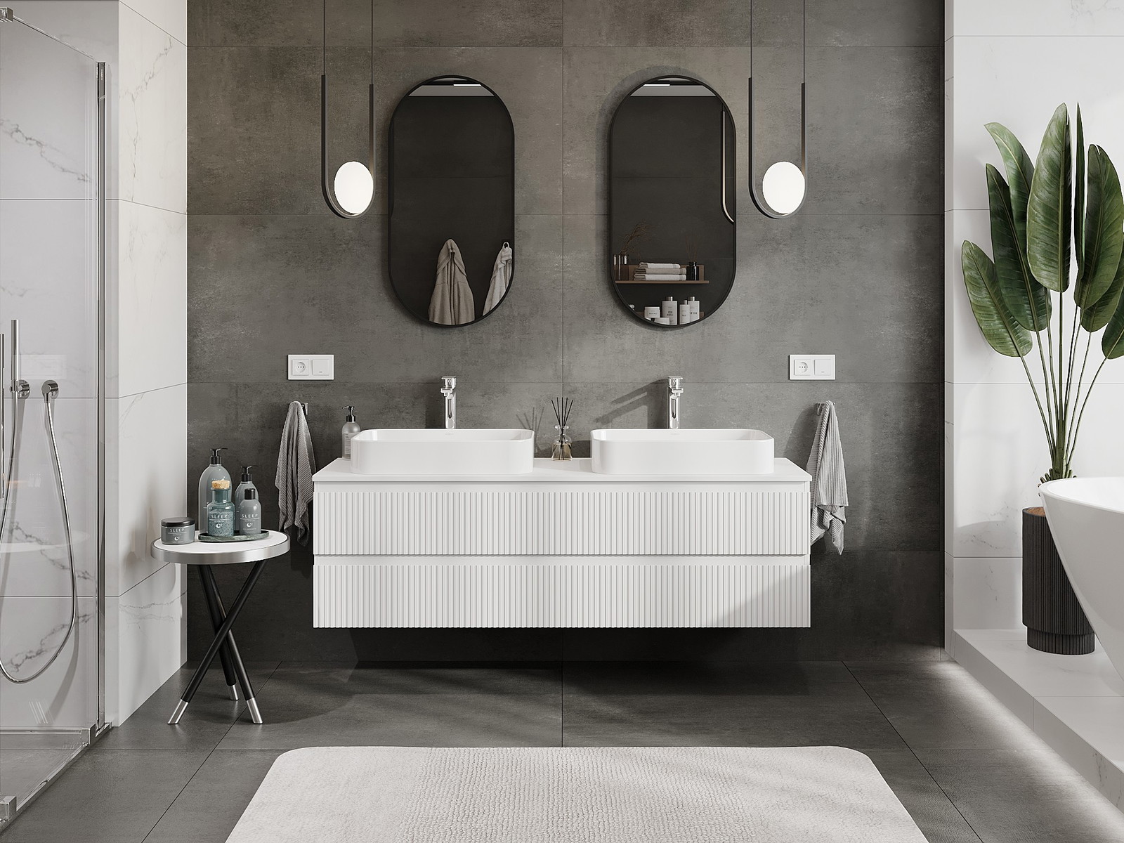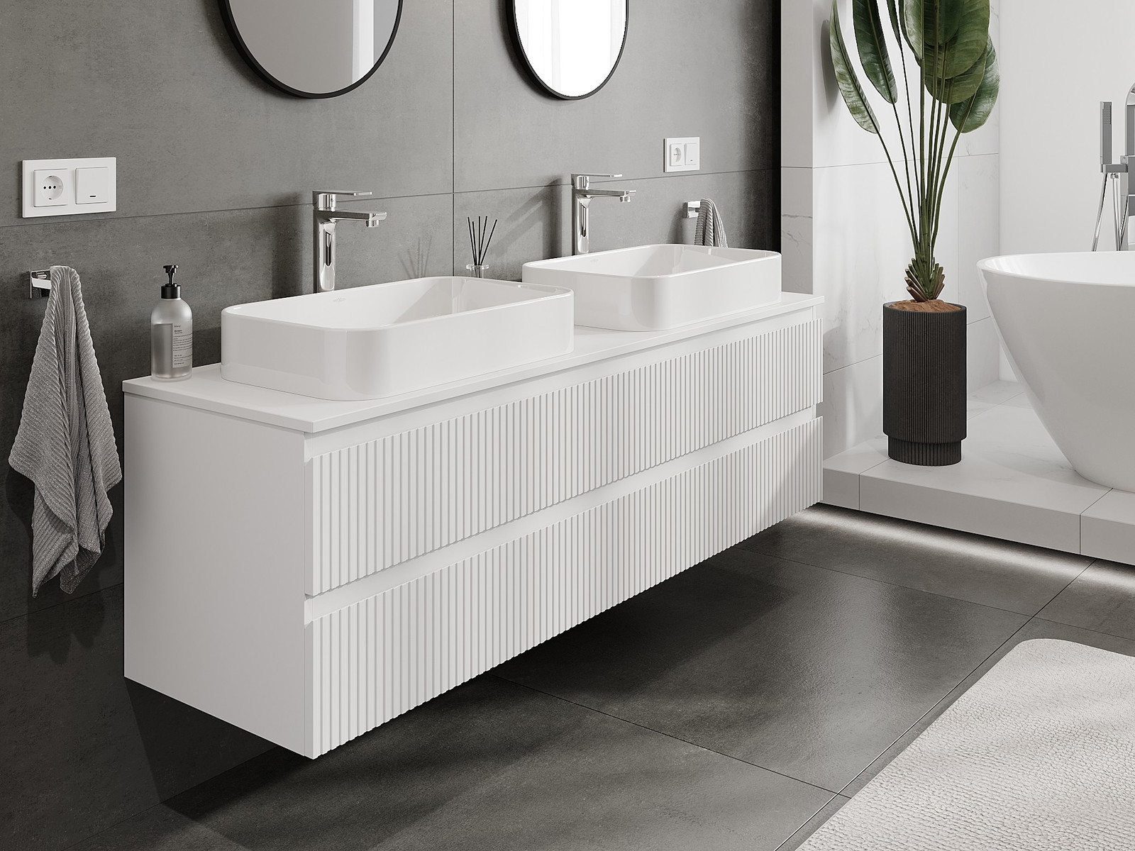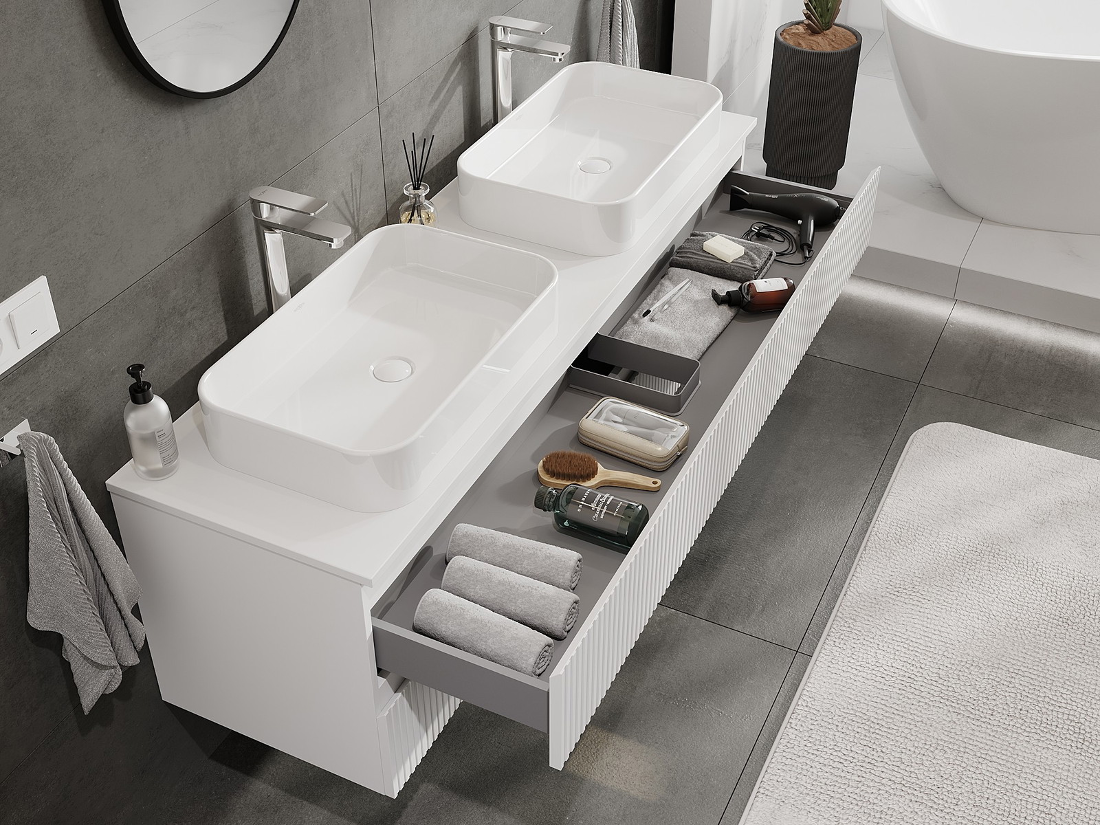 Våra modulära badrumsmöbler kan kombineras i olika färgkonfigurationer, vilket möjliggör fullständig personalisering. Du kan välja både utseende och funktioner för respektive delar, vilket gör att möblerna kan anpassas till dina egna stilistiska och funktionella preferenser.