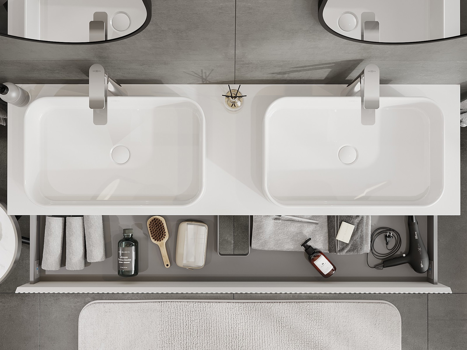 Utskärningen i lådan är utformad på ett sådant sätt att den rymmer vattenlåset som är nödvändigt i tvättställsinstallationer. Tack vare detta kan möbeln installeras fullt ut funktionellt, utan att behöva avstå från utrymme i lådan för installationen.