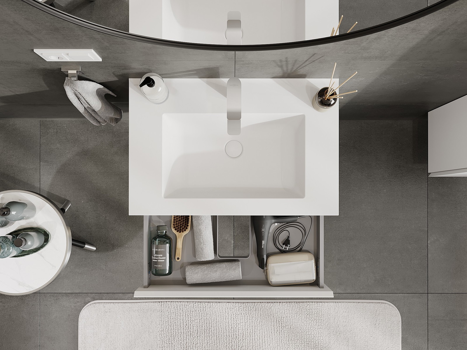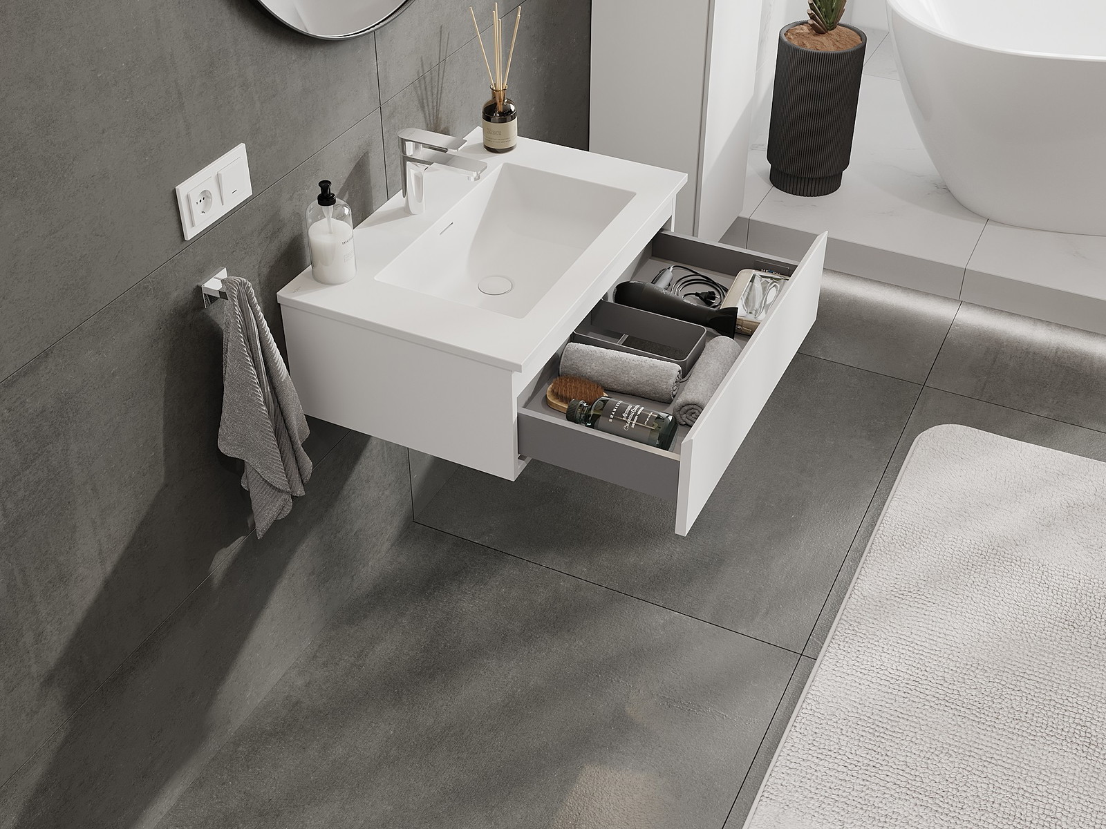 Utskärningen i lådan är utformad på ett sådant sätt att den rymmer vattenlåset som är nödvändigt i tvättställsinstallationer. Tack vare detta kan möbeln installeras fullt ut funktionellt, utan att behöva avstå från utrymme i lådan för installationen.