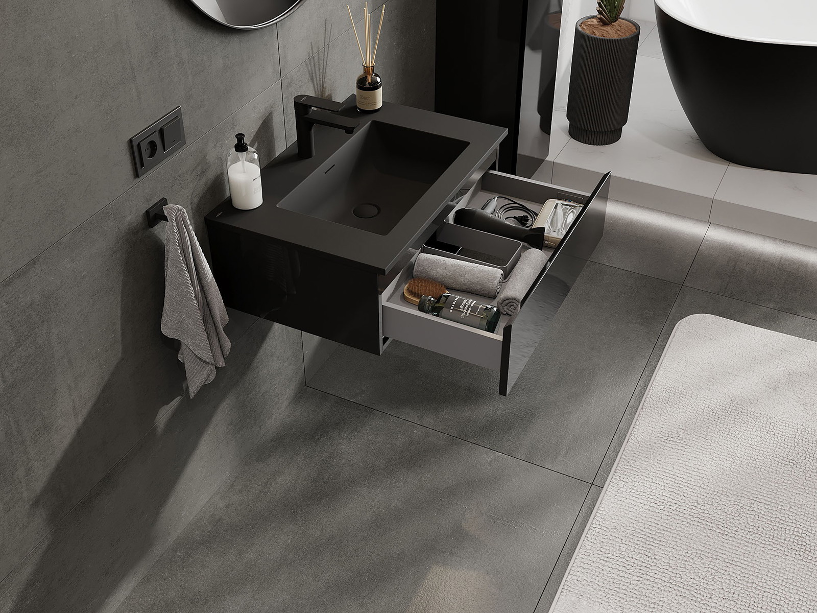 Mexen Orio badrumsskåp 70 cm med handfat Otis, 1 låda, svart glans/svart matt - 91A10-07023-1-BF70-W18M71