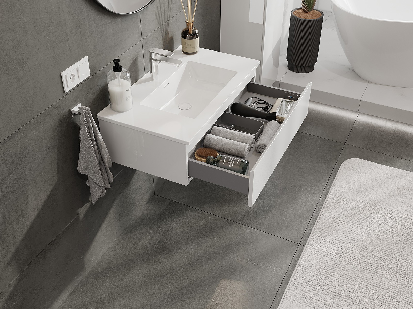 Utskärningen i lådan är utformad på ett sådant sätt att den rymmer vattenlåset som är nödvändigt i tvättställsinstallationer. Tack vare detta kan möbeln installeras fullt ut funktionellt, utan att behöva avstå från utrymme i lådan för installationen.