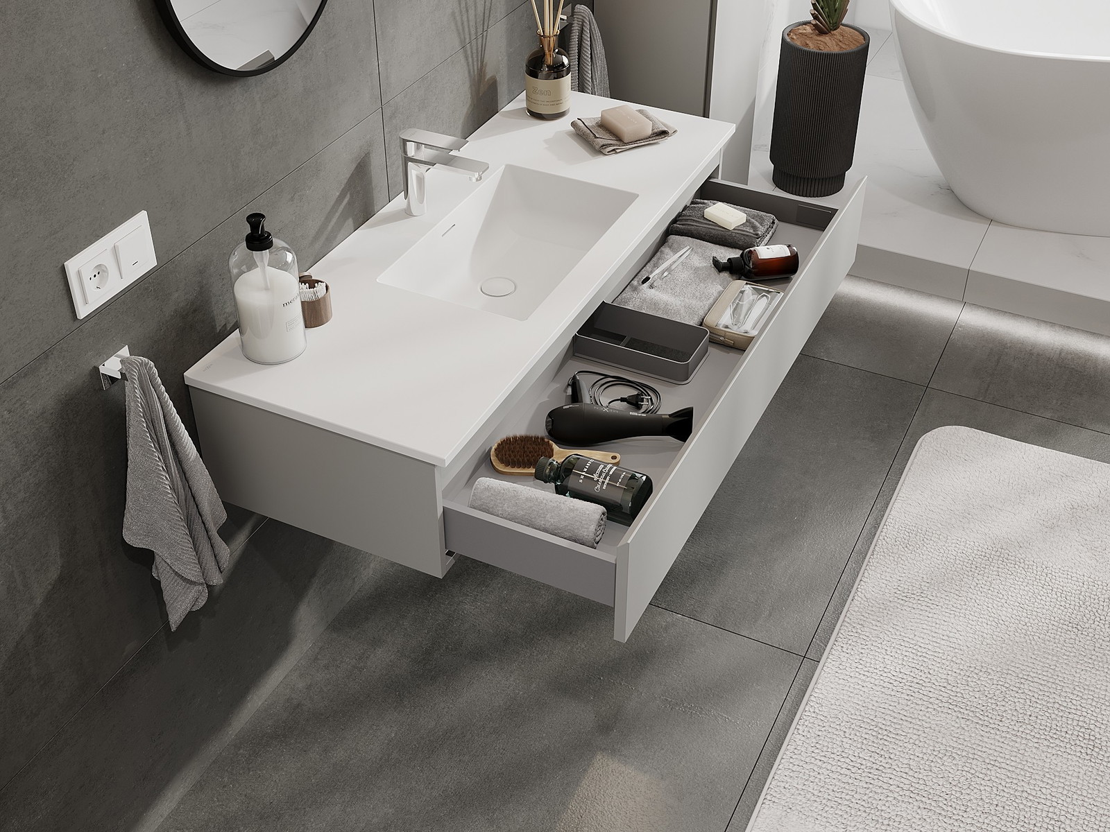 Utskärningen i lådan är utformad på ett sådant sätt att den rymmer vattenlåset som är nödvändigt i tvättställsinstallationer. Tack vare detta kan möbeln installeras fullt ut funktionellt, utan att behöva avstå från utrymme i lådan för installationen.