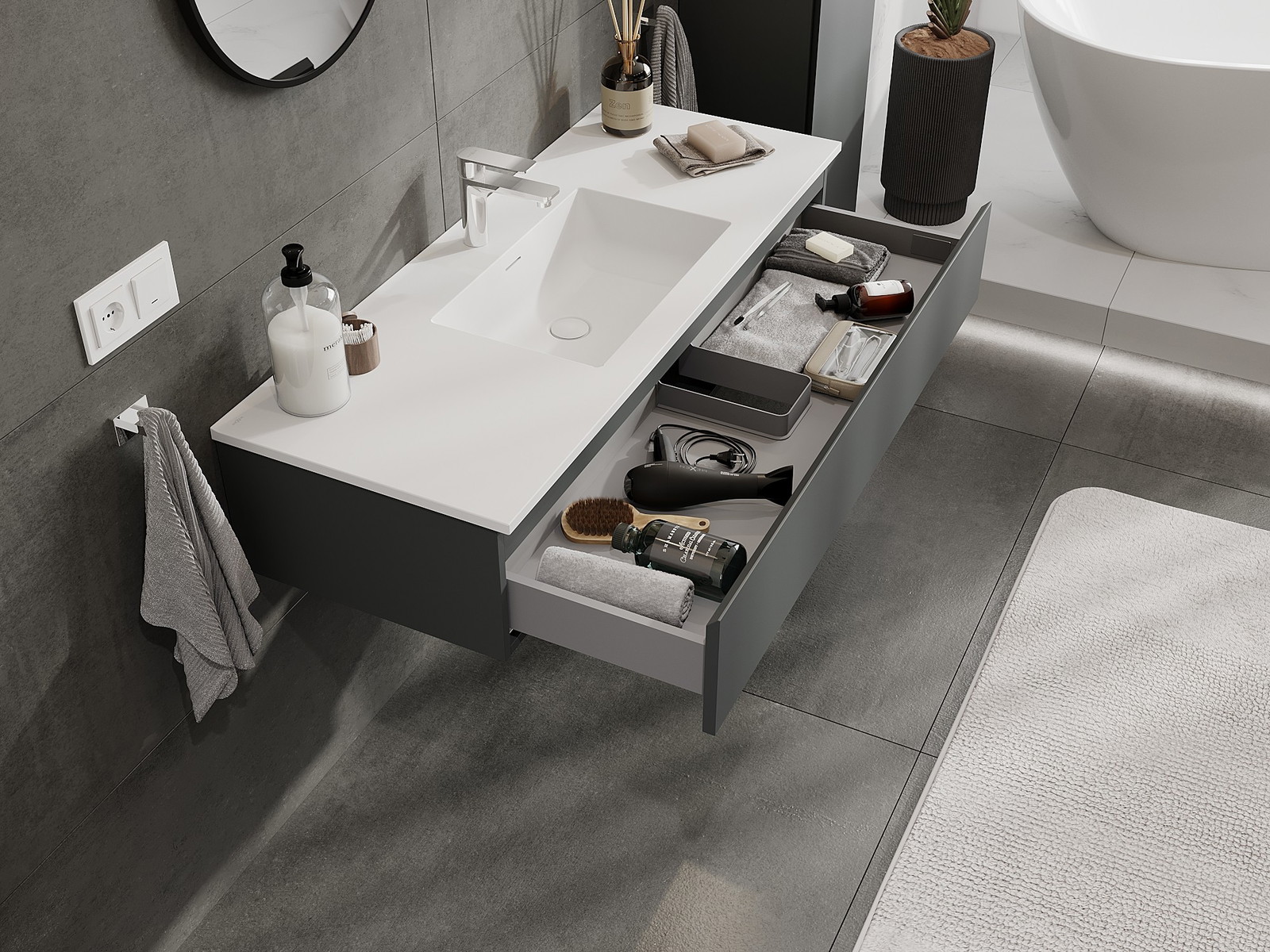 Utskärningen i lådan är utformad på ett sådant sätt att den rymmer vattenlåset som är nödvändigt i tvättställsinstallationer. Tack vare detta kan möbeln installeras fullt ut funktionellt, utan att behöva avstå från utrymme i lådan för installationen.