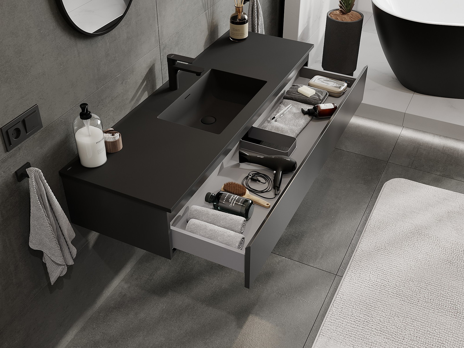 Mexen Orio badrumsskåp 140 cm med handfat Otis, 1 låda, svart matt - 91A10-14023-1-BF71-W18M71
