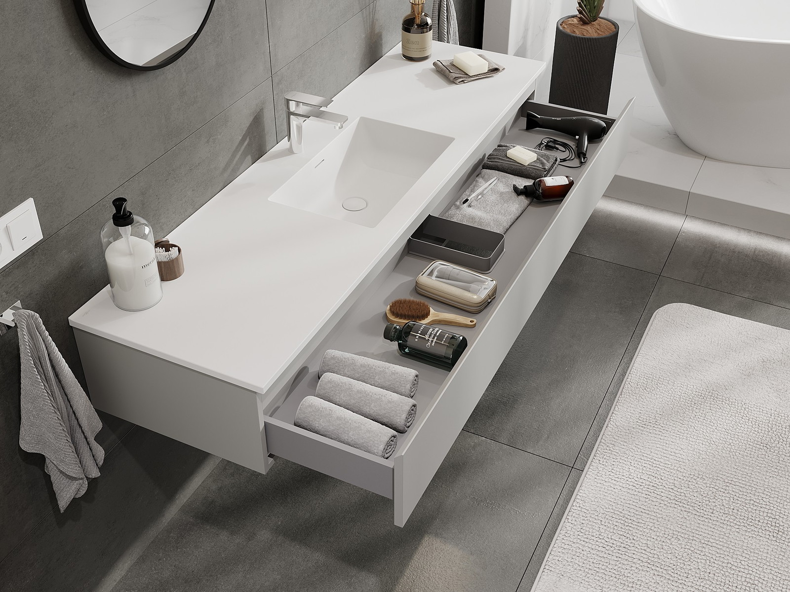 Utskärningen i lådan är utformad på ett sådant sätt att den rymmer vattenlåset som är nödvändigt i tvättställsinstallationer. Tack vare detta kan möbeln installeras fullt ut funktionellt, utan att behöva avstå från utrymme i lådan för installationen.