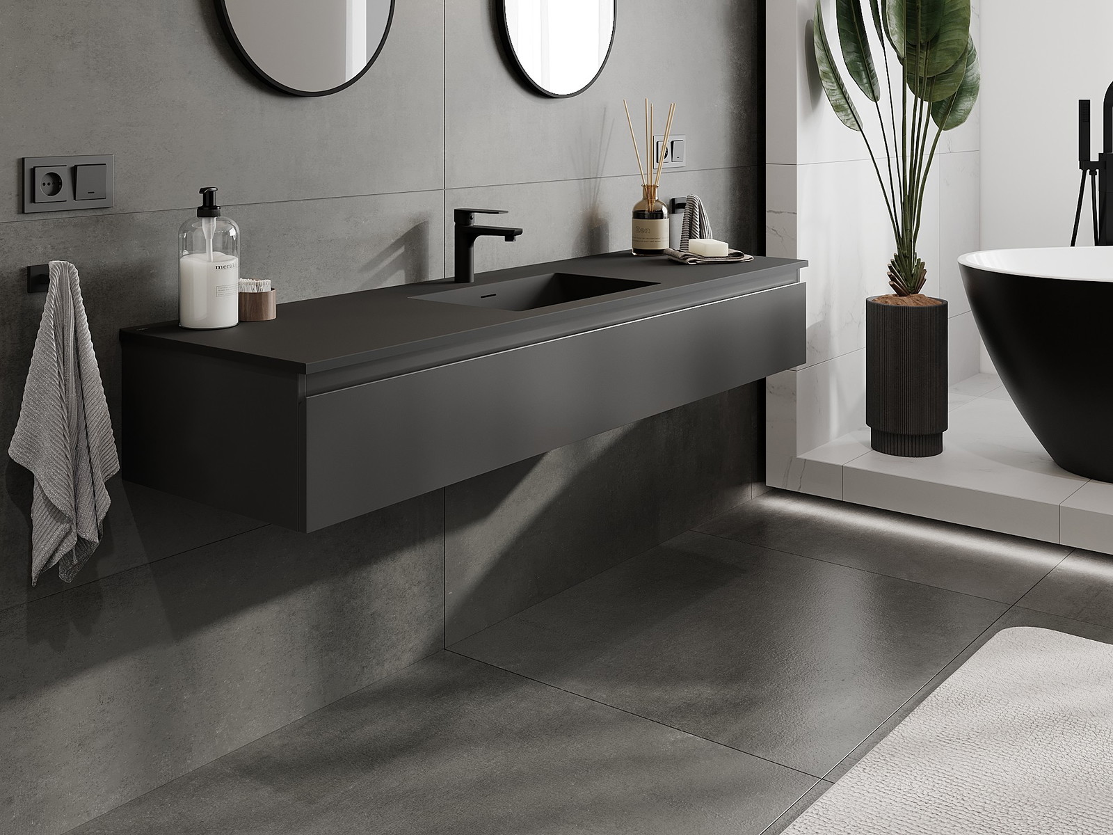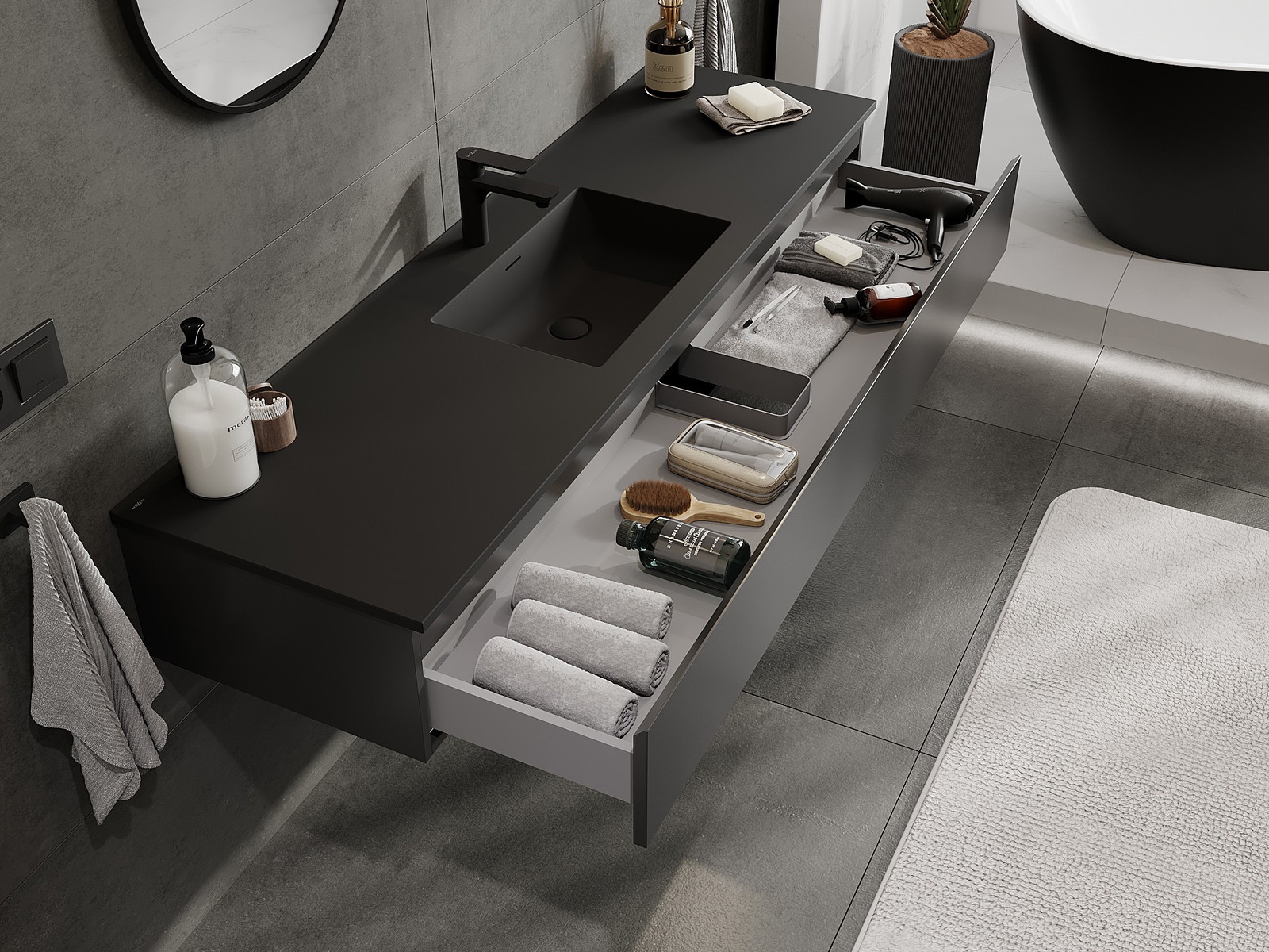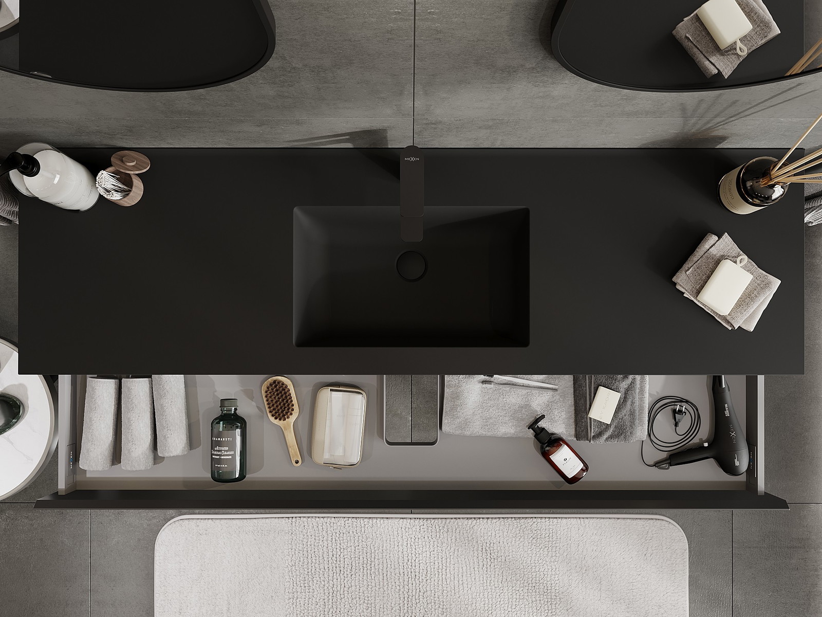 Mexen Orio badrumsskåp 160 cm med tvättställ Otis, 1 låda, svart matt - 91A10-16023-1-BF71-W18M71