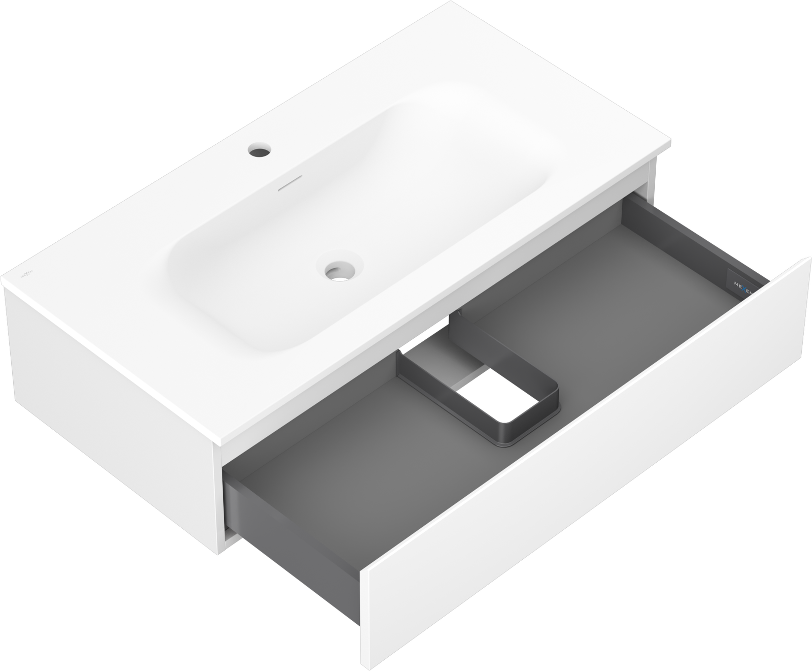 Utskärningen i lådan är utformad på ett sådant sätt att den rymmer vattenlåset som är nödvändigt i tvättställsinstallationer. Tack vare detta kan möbeln installeras fullt ut funktionellt, utan att behöva avstå från utrymme i lådan för installationen.