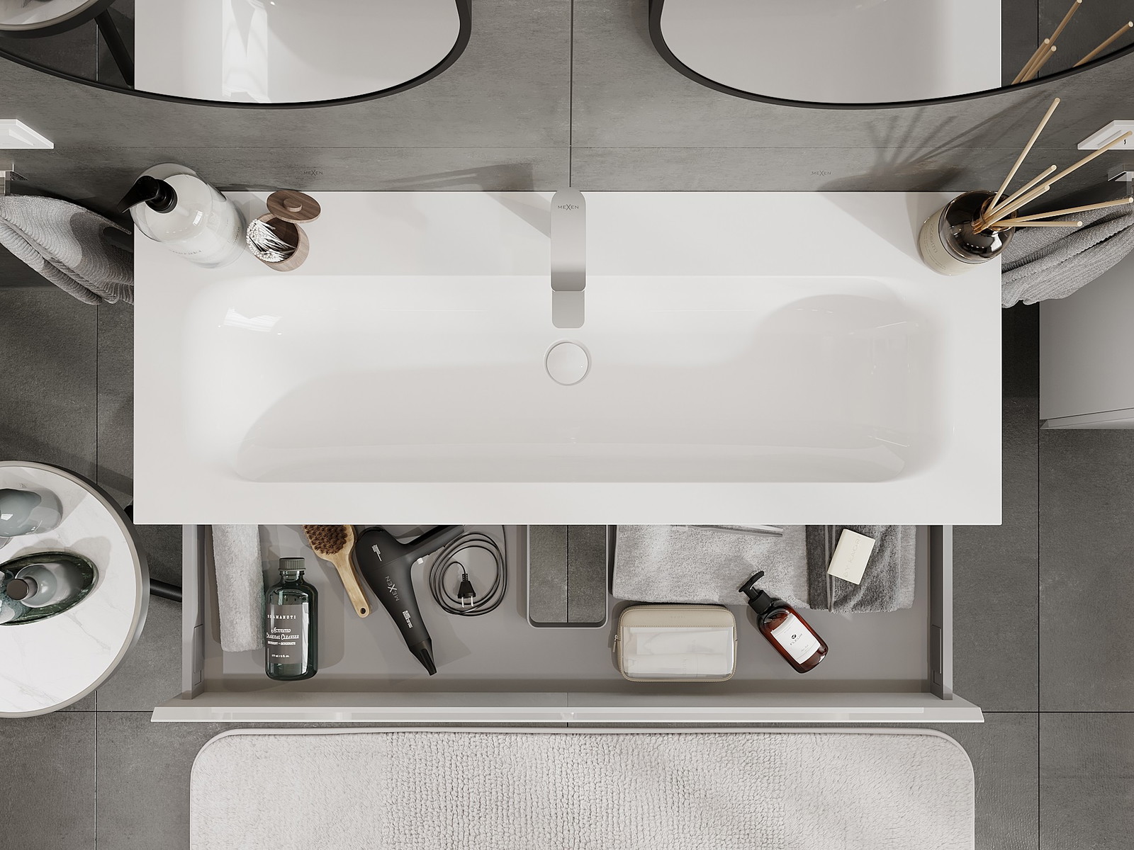 Utskärningen i lådan är utformad på ett sådant sätt att den rymmer vattenlåset som är nödvändigt i tvättställsinstallationer. Tack vare detta kan möbeln installeras fullt ut funktionellt, utan att behöva avstå från utrymme i lådan för installationen.