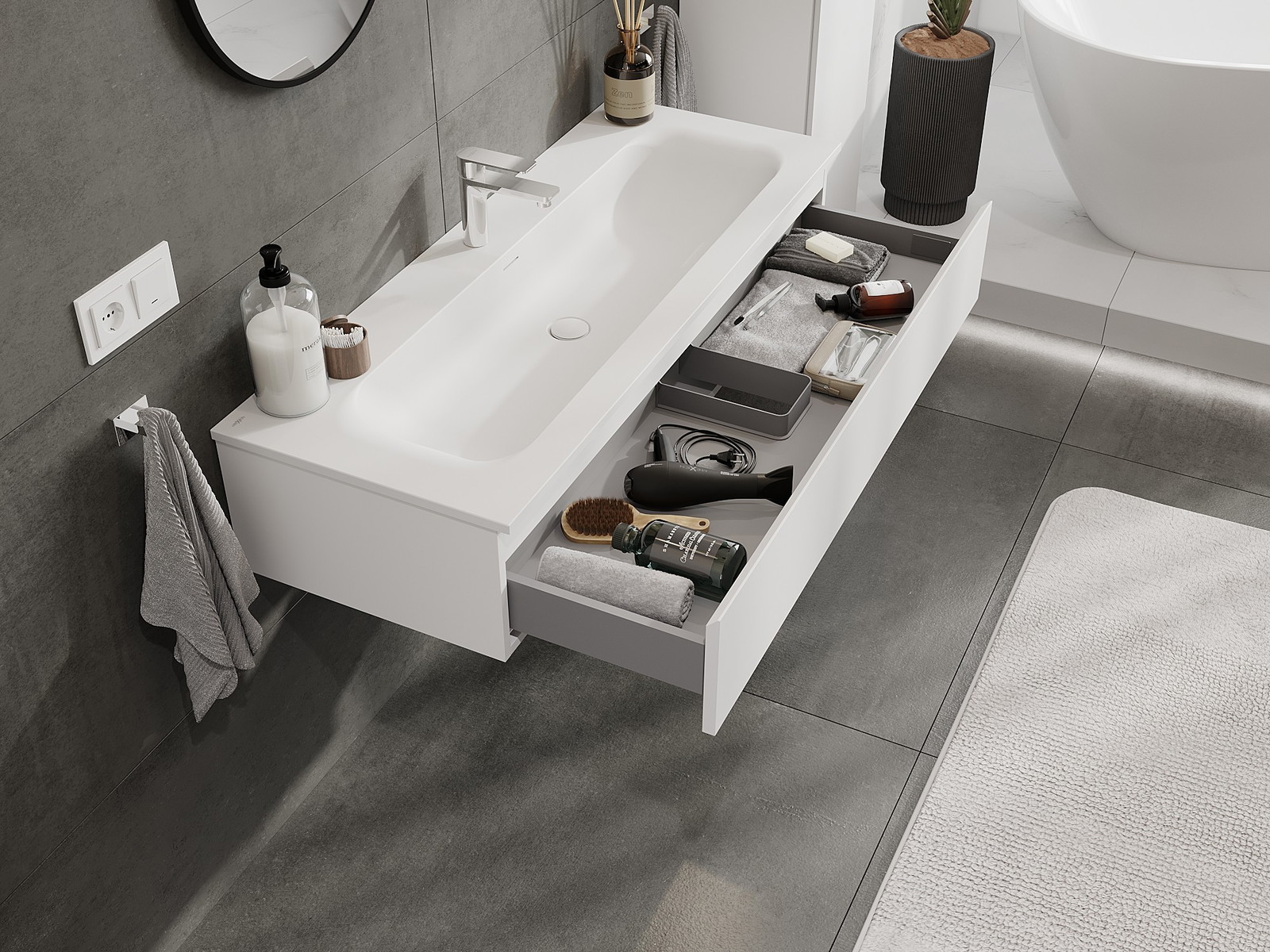 Utskärningen i lådan är utformad på ett sådant sätt att den rymmer vattenlåset som är nödvändigt i tvättställsinstallationer. Tack vare detta kan möbeln installeras fullt ut funktionellt, utan att behöva avstå från utrymme i lådan för installationen.