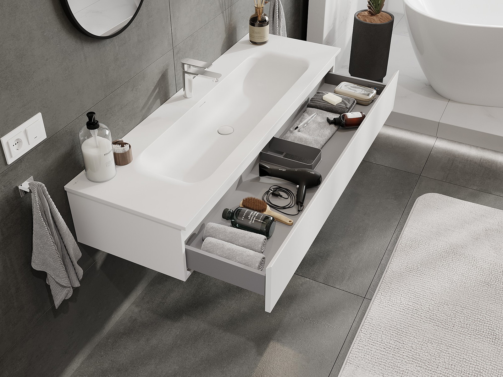 Utskärningen i lådan är utformad på ett sådant sätt att den rymmer vattenlåset som är nödvändigt i tvättställsinstallationer. Tack vare detta kan möbeln installeras fullt ut funktionellt, utan att behöva avstå från utrymme i lådan för installationen.