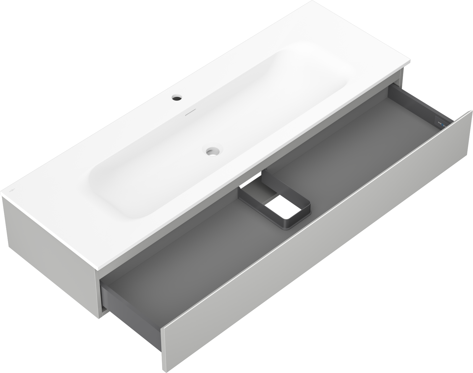 Utskärningen i lådan är utformad på ett sådant sätt att den rymmer vattenlåset som är nödvändigt i tvättställsinstallationer. Tack vare detta kan möbeln installeras fullt ut funktionellt, utan att behöva avstå från utrymme i lådan för installationen.