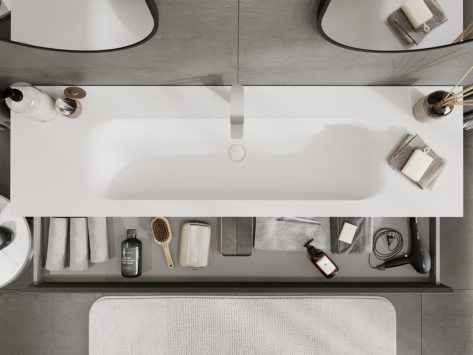Utskärningen i lådan är utformad på ett sådant sätt att den rymmer vattenlåset som är nödvändigt i tvättställsinstallationer. Tack vare detta kan möbeln installeras fullt ut funktionellt, utan att behöva avstå från utrymme i lådan för installationen.