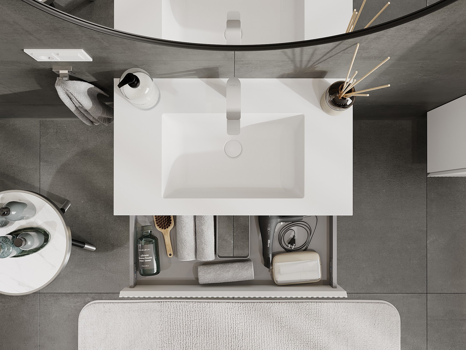 Utskärningen i lådan är utformad på ett sådant sätt att den rymmer vattenlåset som är nödvändigt i tvättställsinstallationer. Tack vare detta kan möbeln installeras fullt ut funktionellt, utan att behöva avstå från utrymme i lådan för installationen.