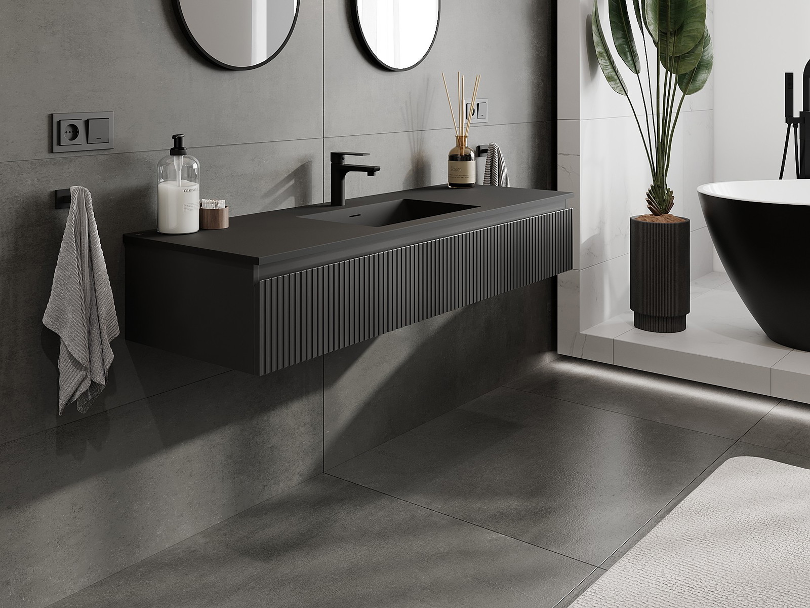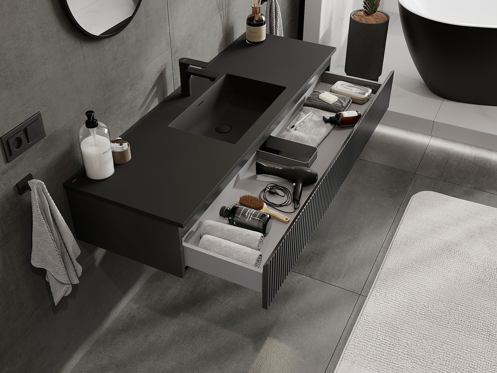 Mexen Rivel Badrumsskåp 140 cm med handfat Otis, 1 låda, räfflad, svart matt - 91A20-14023-1-BF71-W18M71