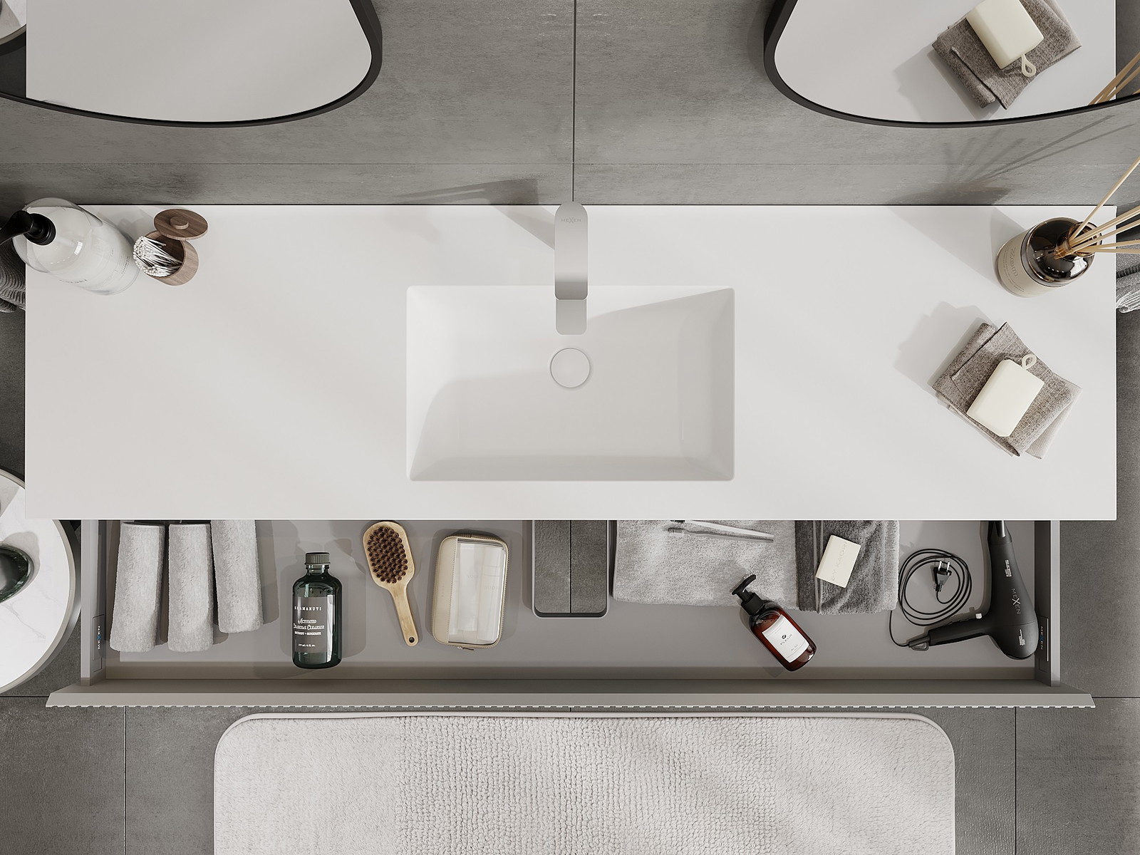 Utskärningen i lådan är utformad på ett sådant sätt att den rymmer vattenlåset som är nödvändigt i tvättställsinstallationer. Tack vare detta kan möbeln installeras fullt ut funktionellt, utan att behöva avstå från utrymme i lådan för installationen.