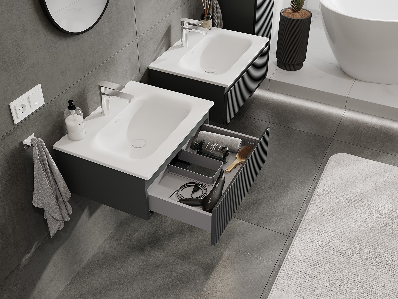 Mexen Rivel badrumsskåp 60 cm med handfat Vela, 1 låda, räfflad, grafit matt/vit matt - 91A20-06023-1-BF66-W23M01