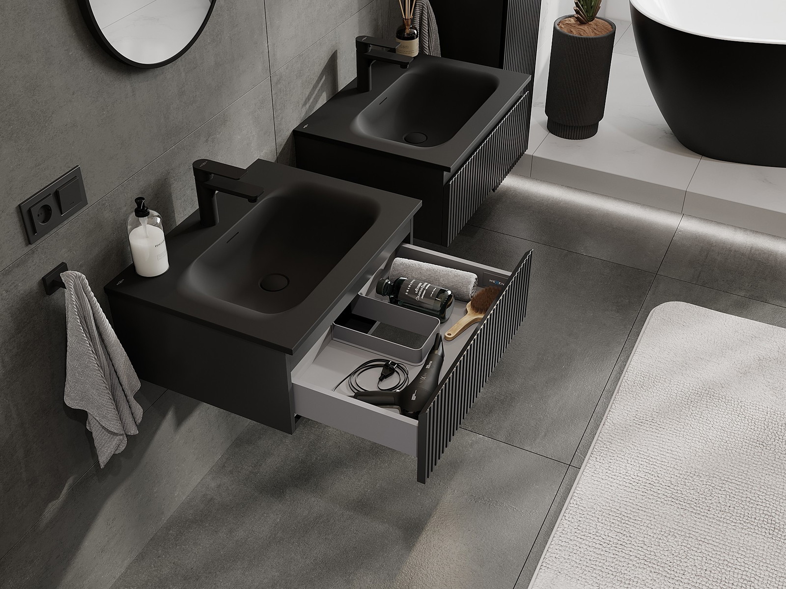 Utskärningen i lådan är utformad på ett sådant sätt att den rymmer vattenlåset som är nödvändigt i tvättställsinstallationer. Tack vare detta kan möbeln installeras fullt ut funktionellt, utan att behöva avstå från utrymme i lådan för installationen.