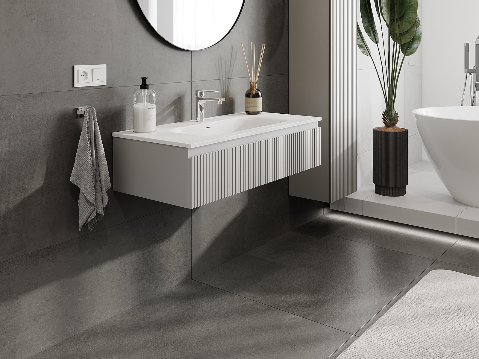 Mexen Rivel 100 cm badrumsskåp med handfat Vela, 1 låda, räfflad, grå matt/vit matt - 91A20-10023-1-BF62-W23M01