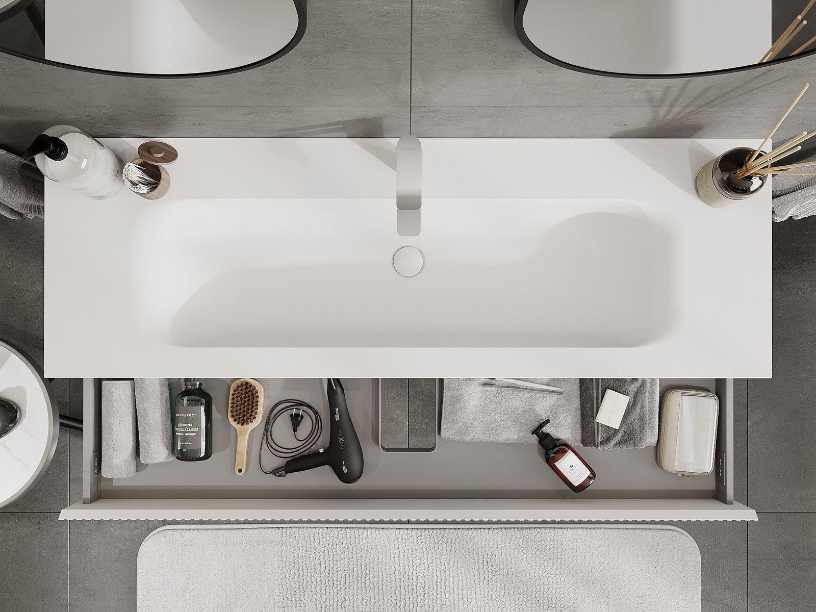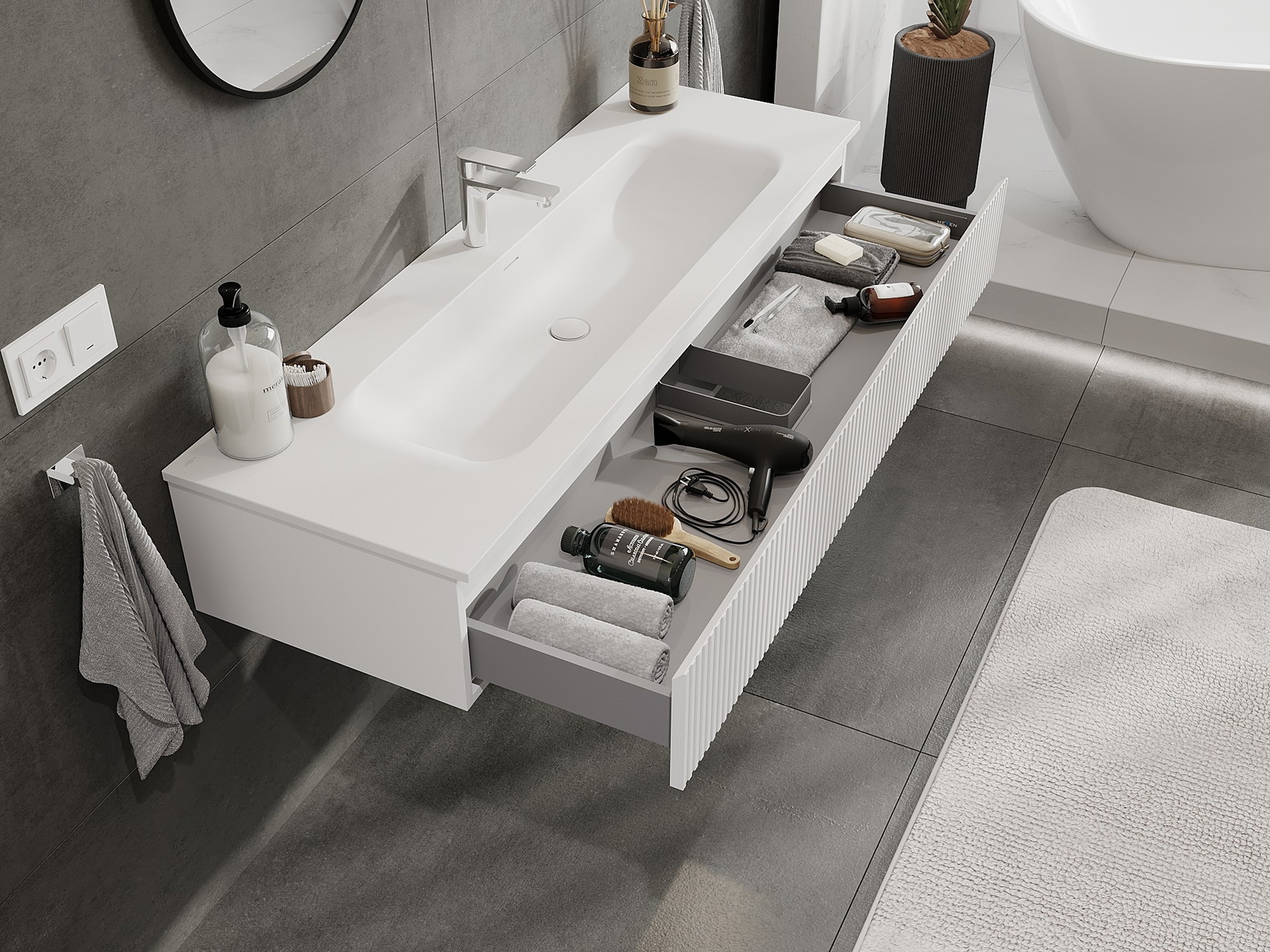 Utskärningen i lådan är utformad på ett sådant sätt att den rymmer vattenlåset som är nödvändigt i tvättställsinstallationer. Tack vare detta kan möbeln installeras fullt ut funktionellt, utan att behöva avstå från utrymme i lådan för installationen.